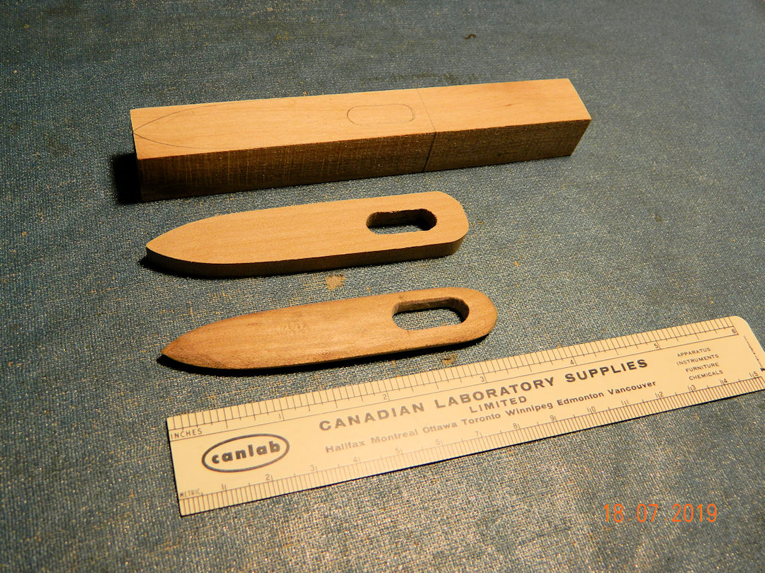 Cutting guide with a blank mounted. Makes nice straight cuts. The blank is cut to shape (this one is curved) and the eye cut by drilling two holes the right distance apart, then joining them with a fret saw.