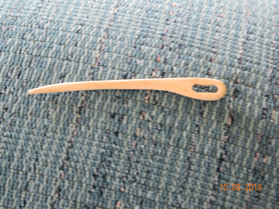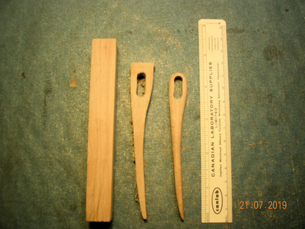 Nalbinding is a Scandinavian form of "knotless knitting", using only one needle. Think of it as interlocking chain knotting yarn. One of the local weavers asked if I could make needles, after she attended a class at the conference in Prince George this summer. She found the needle from the class was not smooth, and required sanding to keep it usable. After looking up what Nalbinding is on the Internet, it looked like a doable project. These are the three stages of my first attempt. Top is the blank wood (hard eastern maple), Rough out, Finished on bottom.