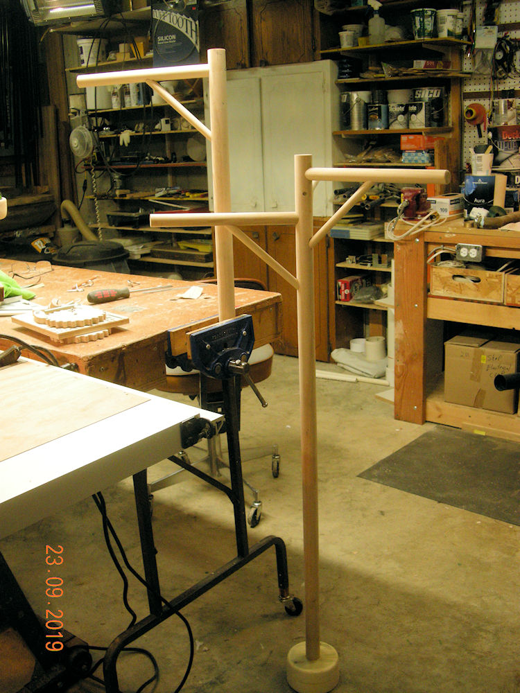The pictures started a little later in this project so this is well along in the time line. The front post is the replacement for the failing one. The back post is the test version needed to figure out how to drill the 45o holes required to mount the support arms.