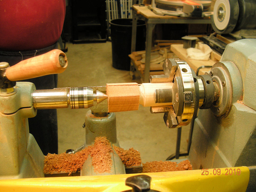 Lathe setup used to turn the end caps. Just to note: I shy away from any turning job that requires making more than one of anything. This job required three caps for the arms and one for the top of the post.