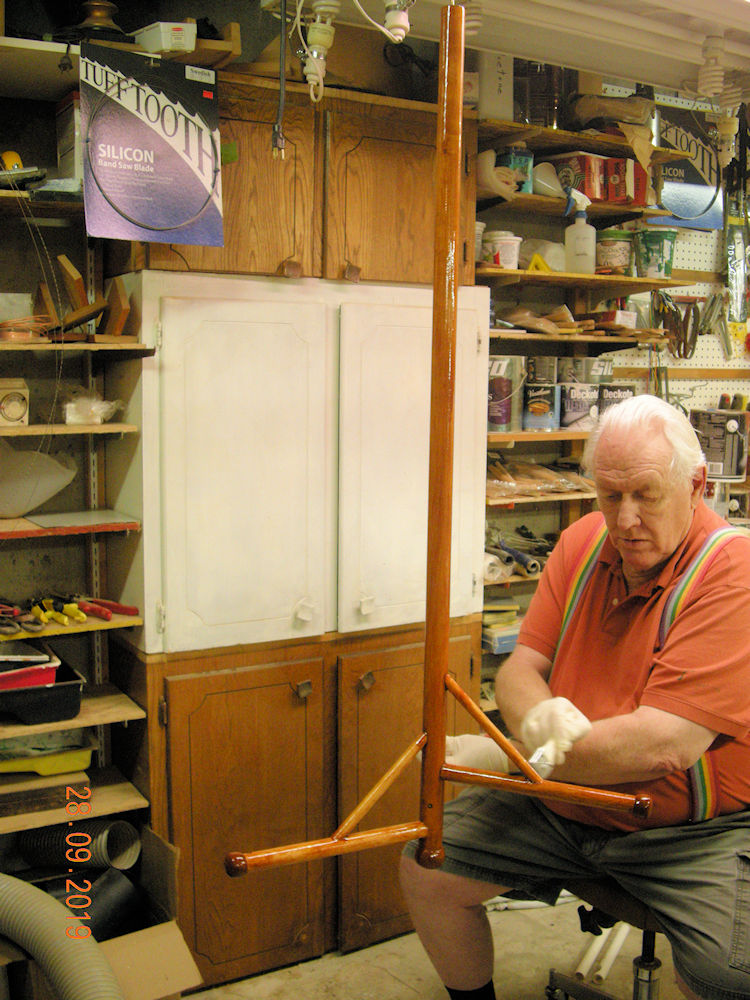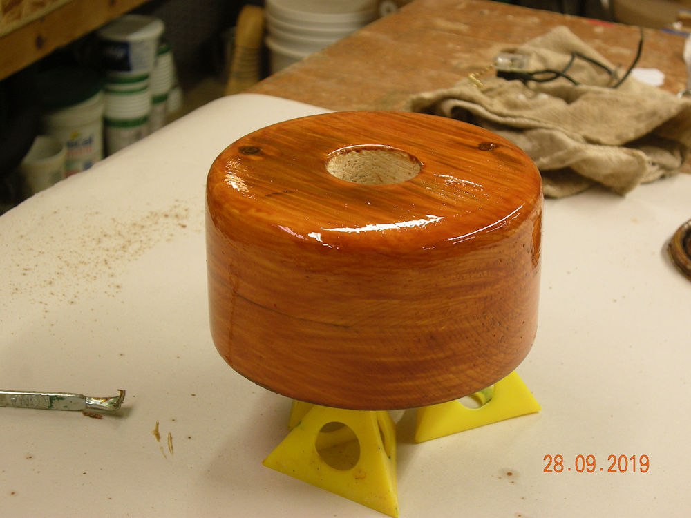 This is the new mounting base. Turned from pressure treated SPF. This is while the second coat of stain is still wet and shiny.