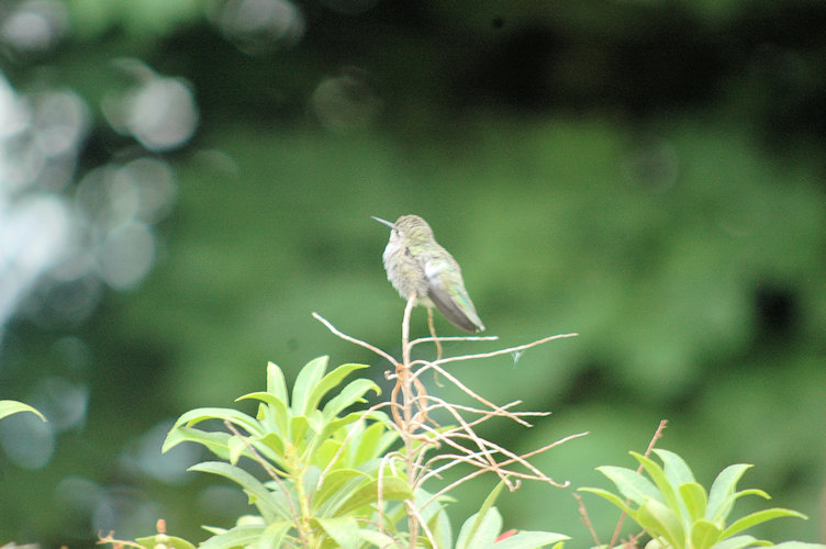 Hummers are starting to "q" up for access to the feeder. Sat on the tree about 15 feet from the feeder and 6 feet outside the kitchen window long enough to allow us to get a camera.