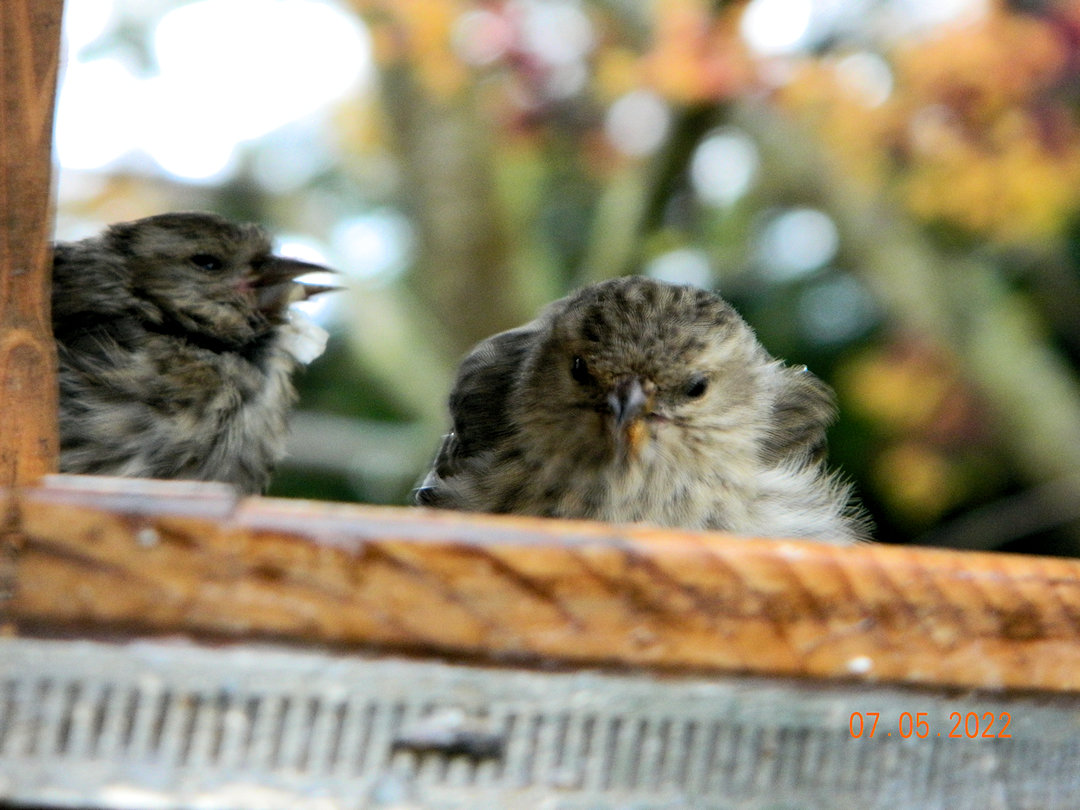 Very young Siskin. We were having much rain at the time, and these guys were not worried about us standing there holding the deck awning up to get this picture