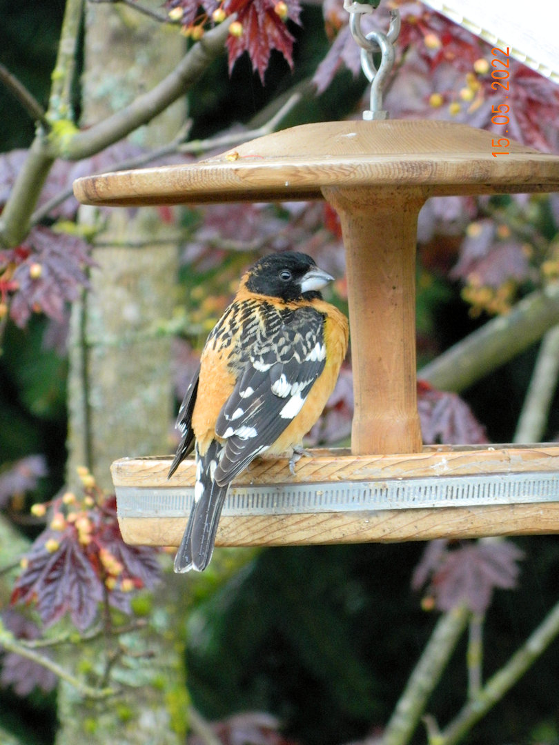 This is a new-to-us visitor. The bird book says he is a Black Headed Grosbeak. He stayed and let us admire him for about ten minutes.