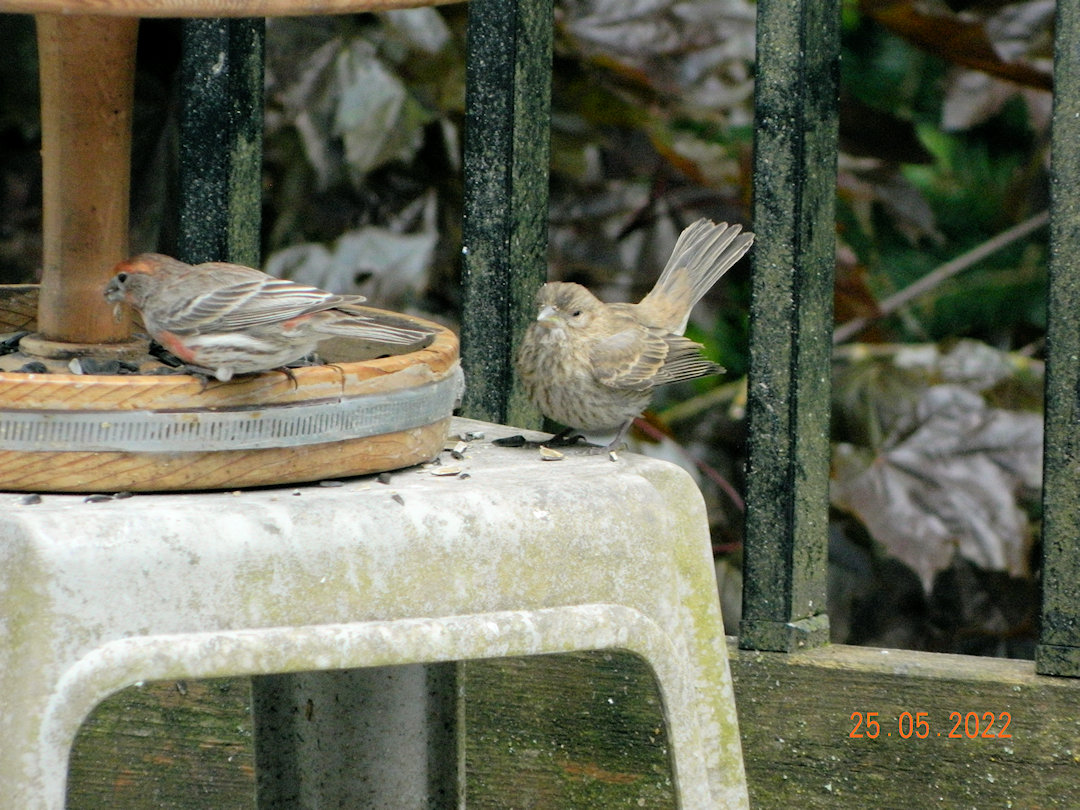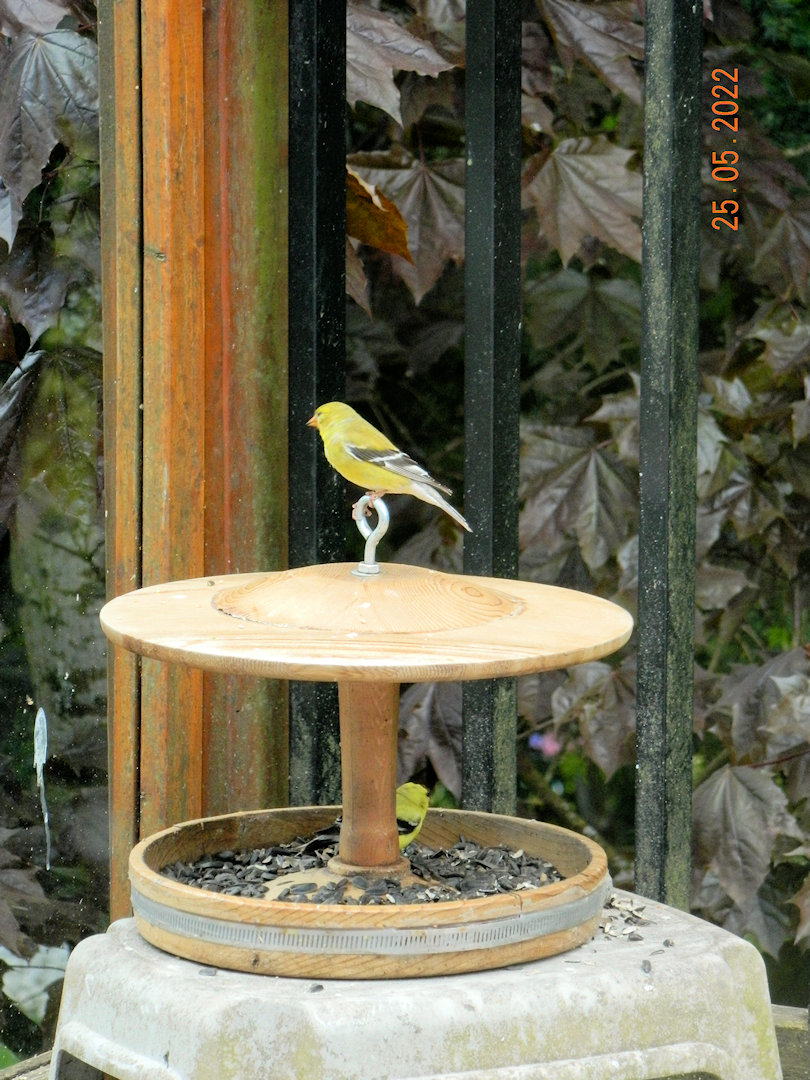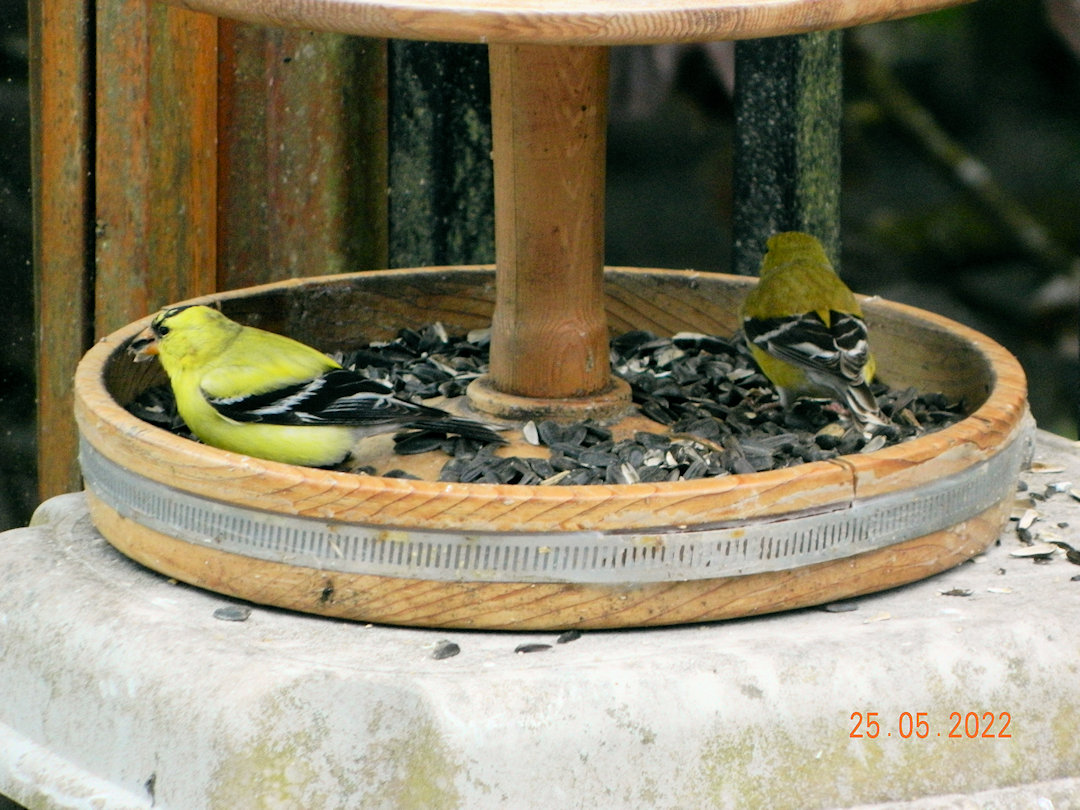 A pair of Gold Finches visiting the feeder that had been set on a stool out of the wind.