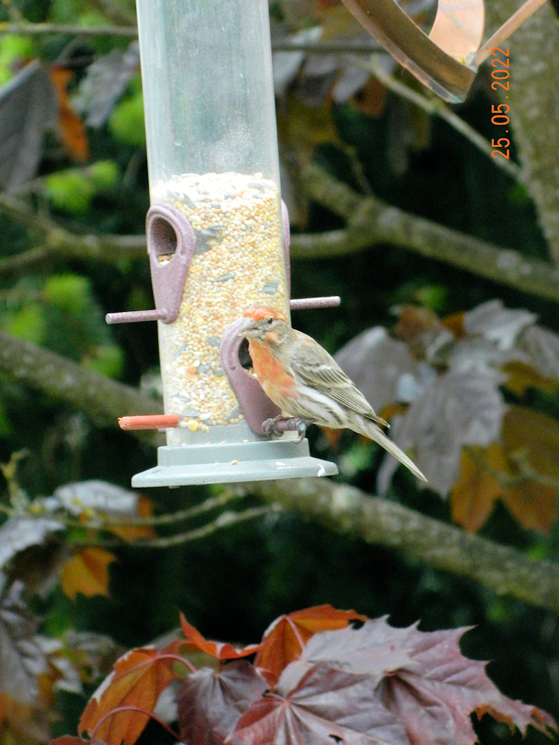 Probably a House finch. It stayed and had a good meal.