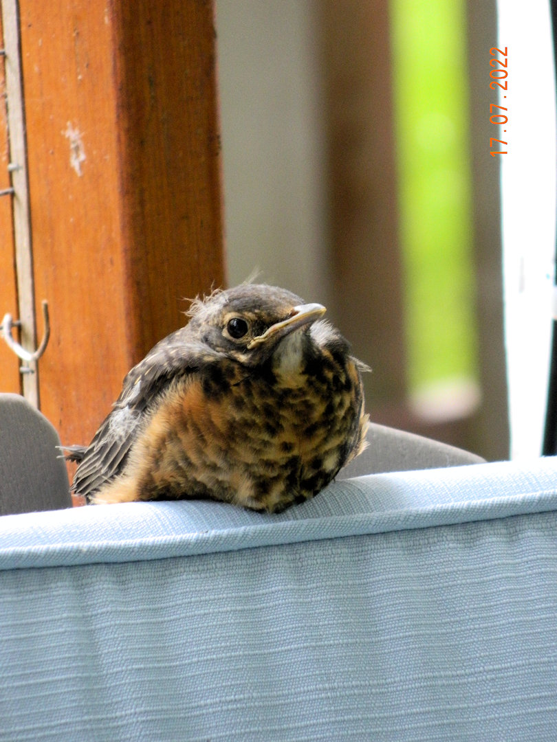 A baby robin adopted one of our lawn chairs as a place to sit. Spotted him when his frantic mother was calling loudly to get him move away from the house. She eventually came with food in her mouth and tempted him to flutter away.