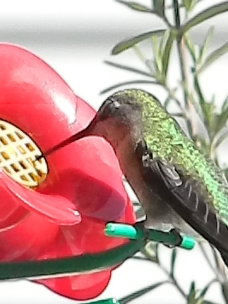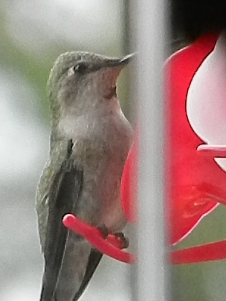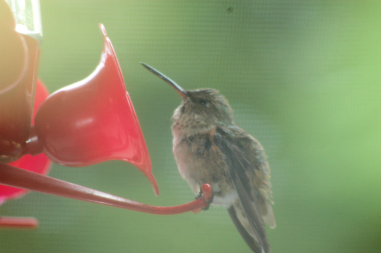 A baby hummingbird - probably an Anna's - visited the feeder. The picture is a little fuzzy because it was taken through the screen on the kitchen window.