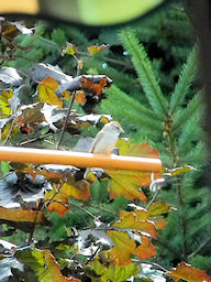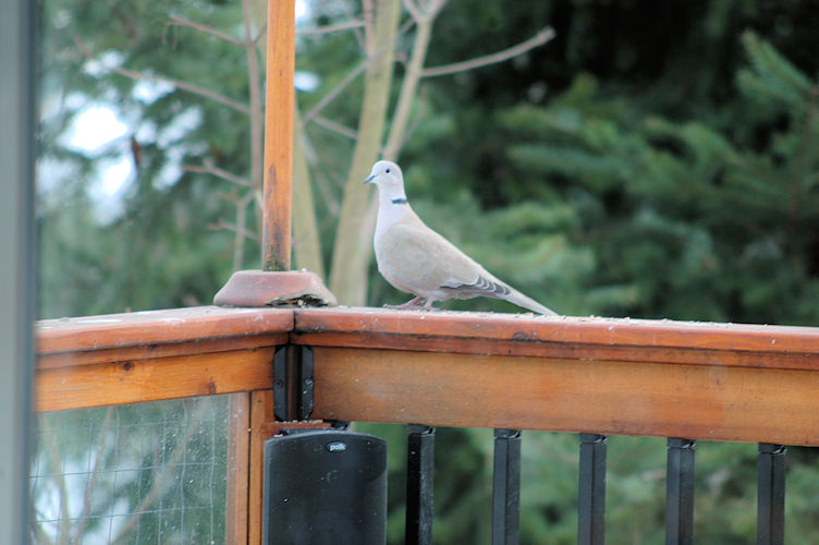 Oh, oh! The Ring Necked doves have found us! This one is elegant, but they are messy and noisy so we don't encourage them to hang around. We had a whole flock in Kelowna. Notice that there is no snow on the railing or in the trees behind. Two days before it was over a foot thick!