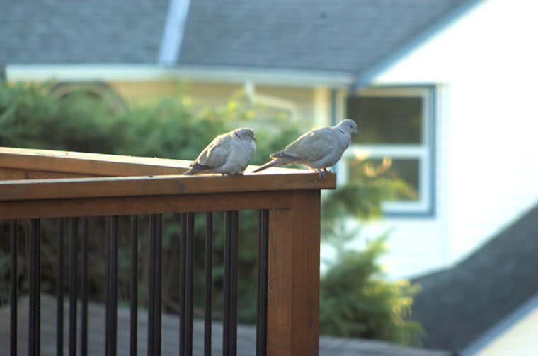 A pair of ring-necked doves has decided to hang around in our neighbourhood. They looked chilly this morning.