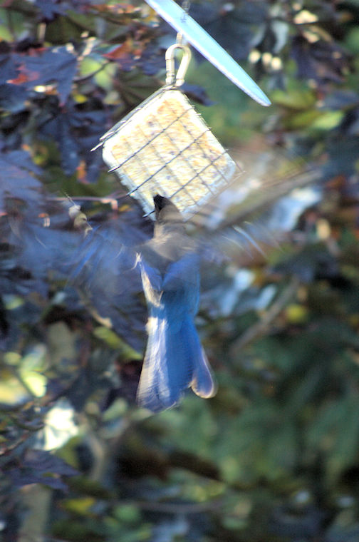 A Stellar's Jay has found our suet feeder. He leaps and grabs a bite then drops back to the railing. Hard work for a small bite!