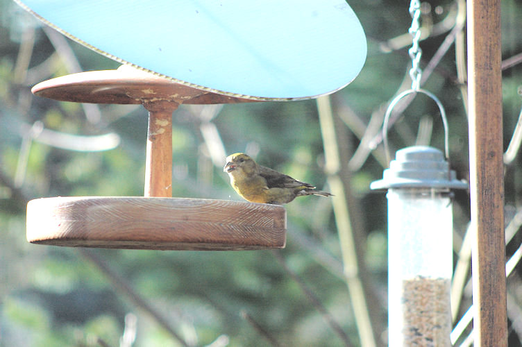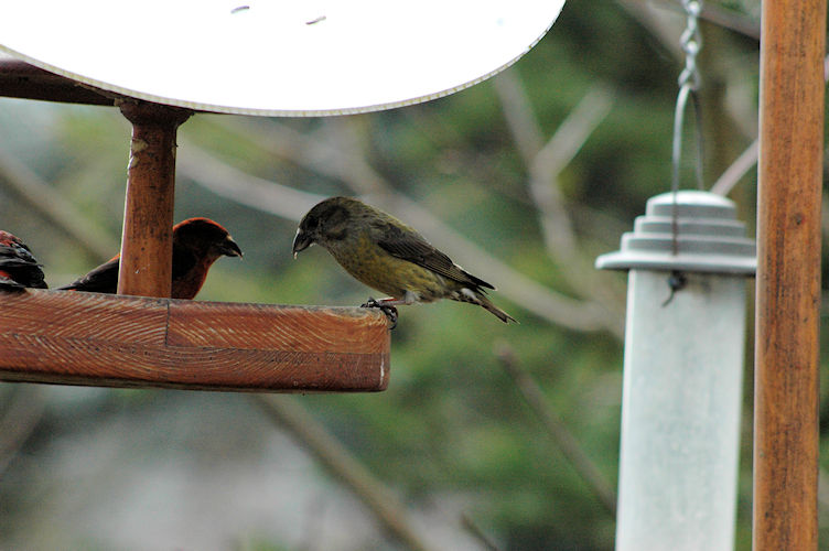 A brand new visitor to our feeder. We believe that this fellow is a Red Crossbill. There are two pairs - the females are a dull yellow where the males are red. Crossing our fingers that they hang around!