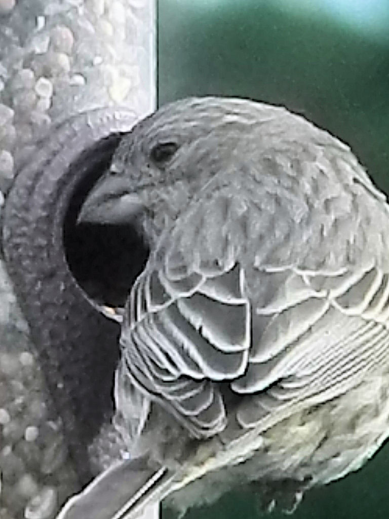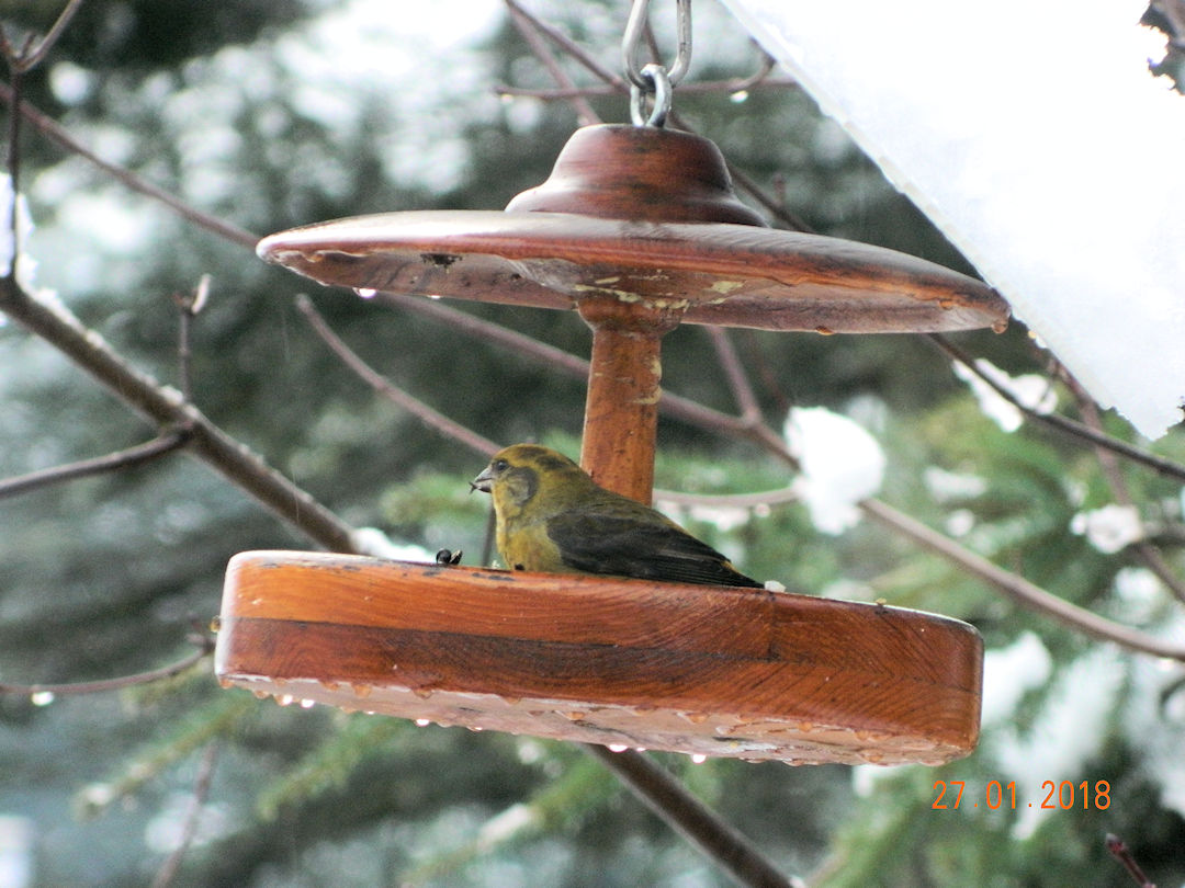 We think that this visitor is an American Goldfinch in his winter coat. There were four of them at one point. They liked to stay in the feed tray out of the snow.