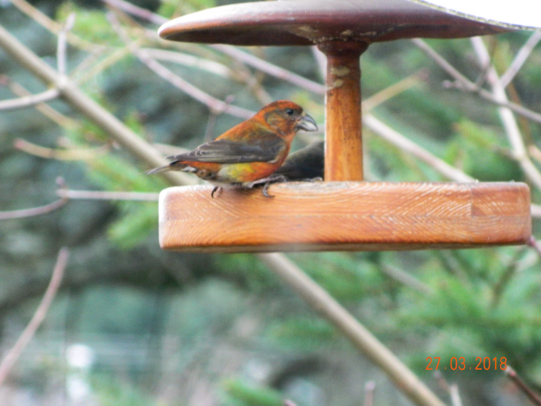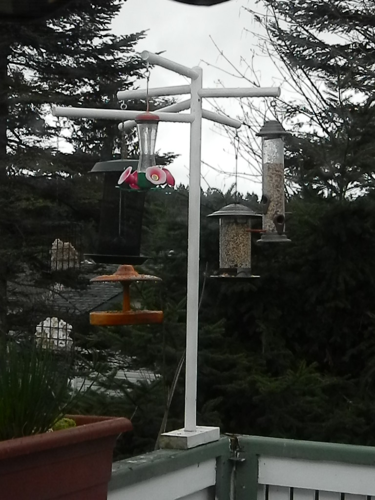 Allan turned a new tray feeder, hoping to attract larger birds like the thrush. It and a hummingbird feeder have been added to the feeding "tree." April 5, 2014