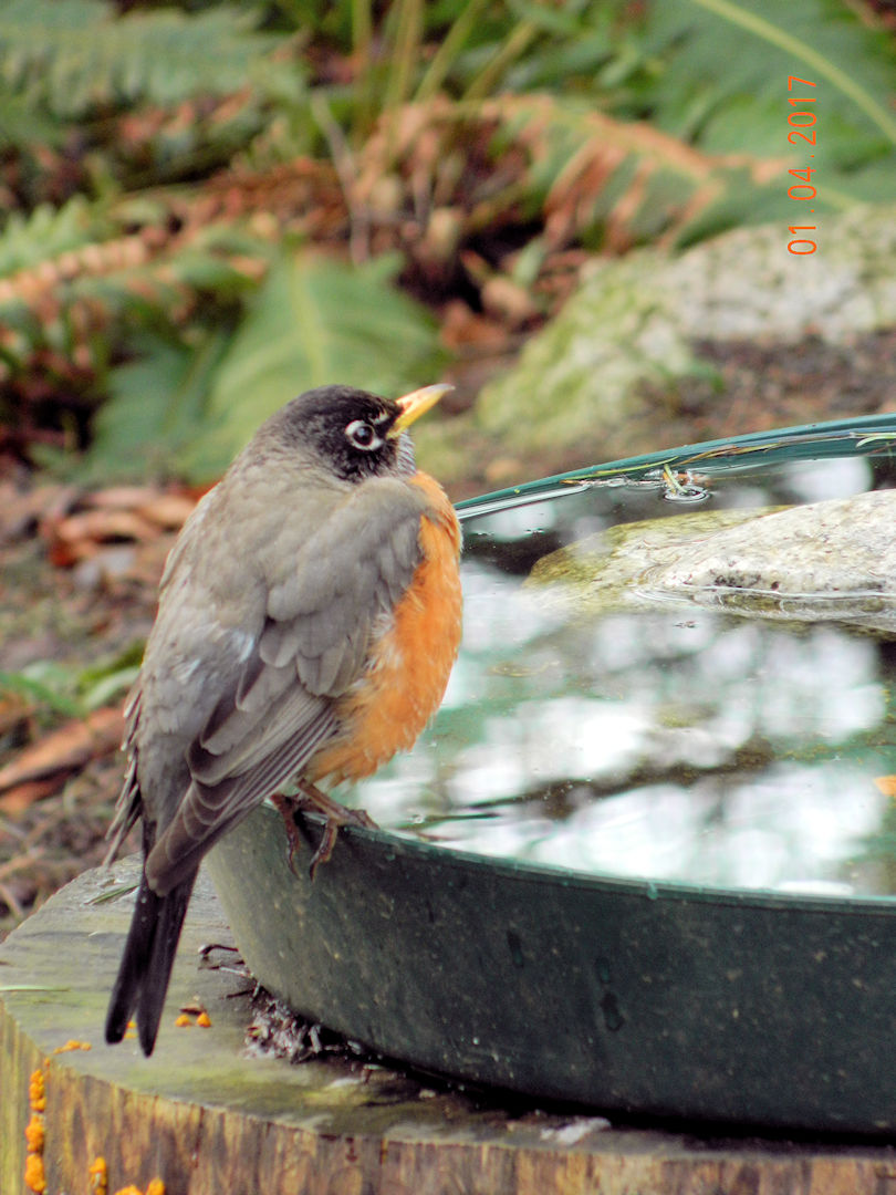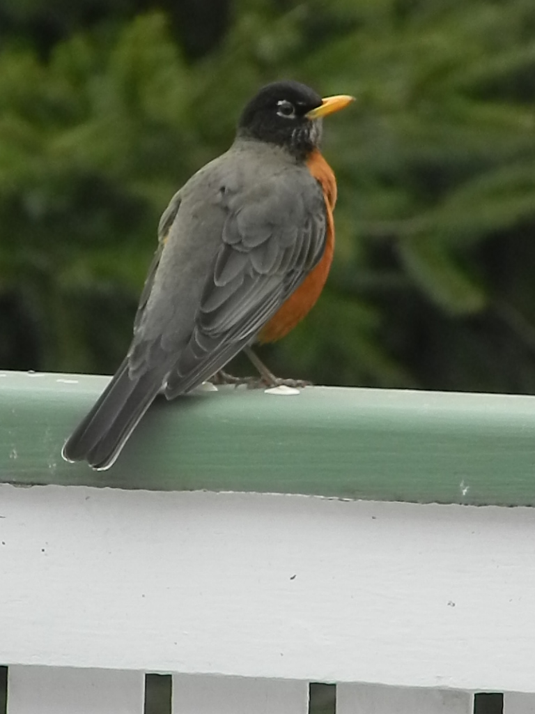 Mr. Robin stopped by the deck on day. Mostly they hang around the backyard cherry and the cedars. April 10, 2014