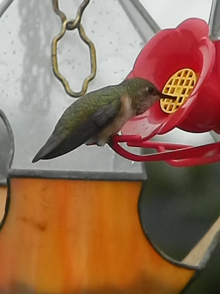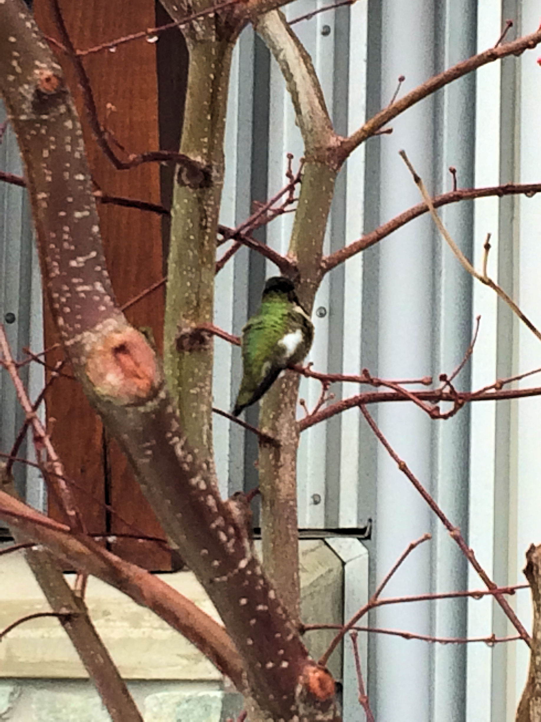 This is one of several hummingbirds who frequent our three feeders. I think that it is a female Anna's. She was around on and off all winter. April 5, 2014
