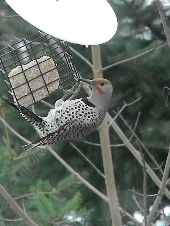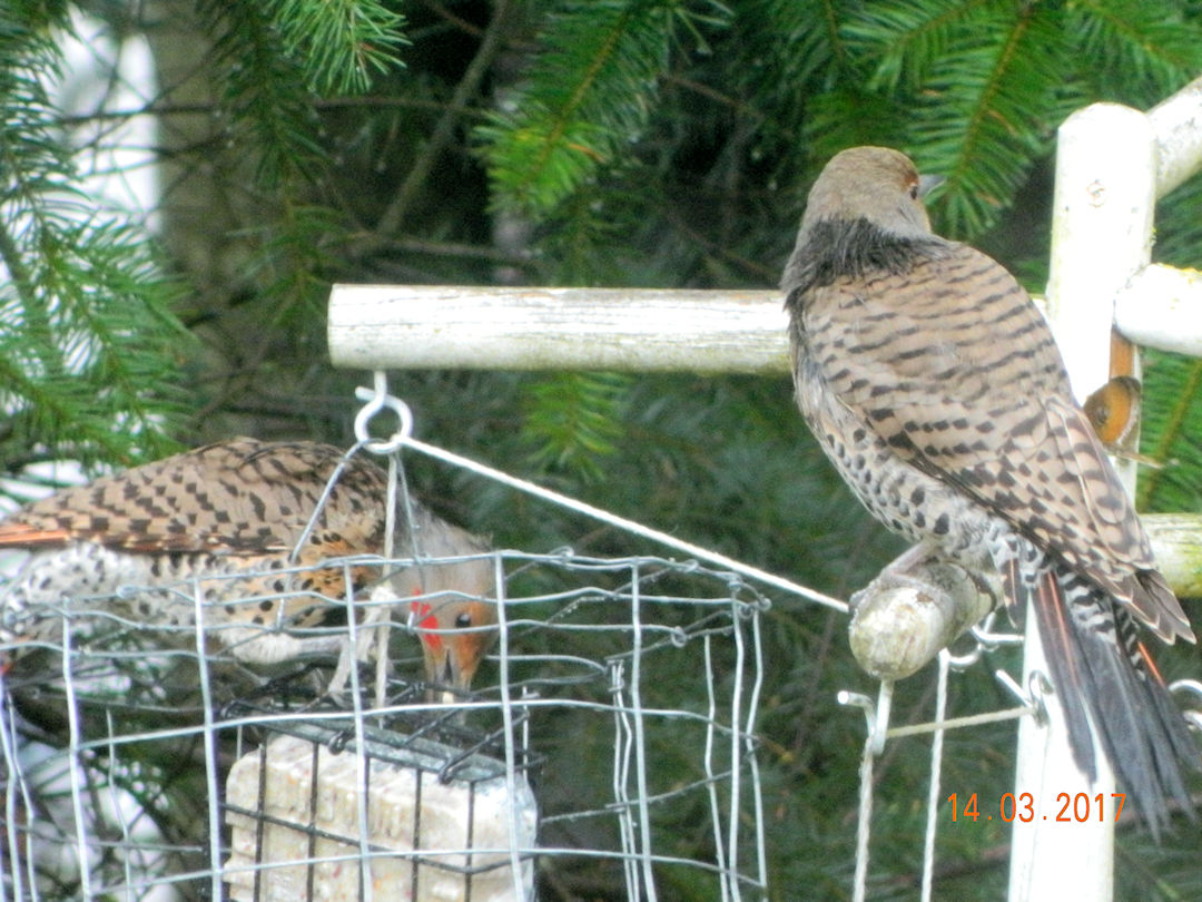 A solitary flicker has been a frequent visitor this winter, but we've never before seen two at once. The female flicker sat patiently for about 5 minutes while the male ate his fill at the suet, then he left and she had her turn.