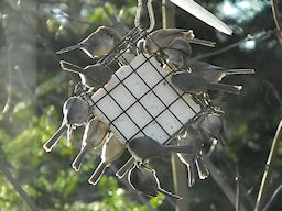 These little birds have been identified as Common Bushtits. They swoop in all at once on the suet and are gone again in minutes, twittering happily.