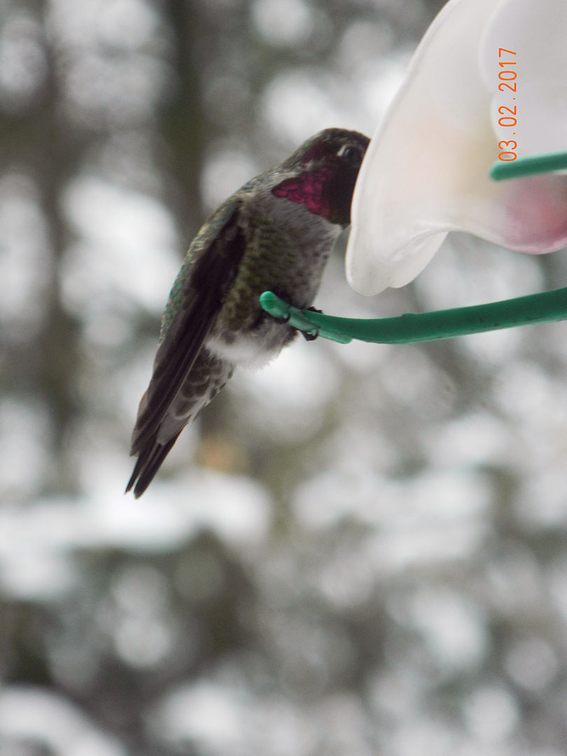 The Anna's hummingbird that lives in our yard was happy to find a feeder still available. I'm not sure if the white on his undercarriage is feathers or snow!