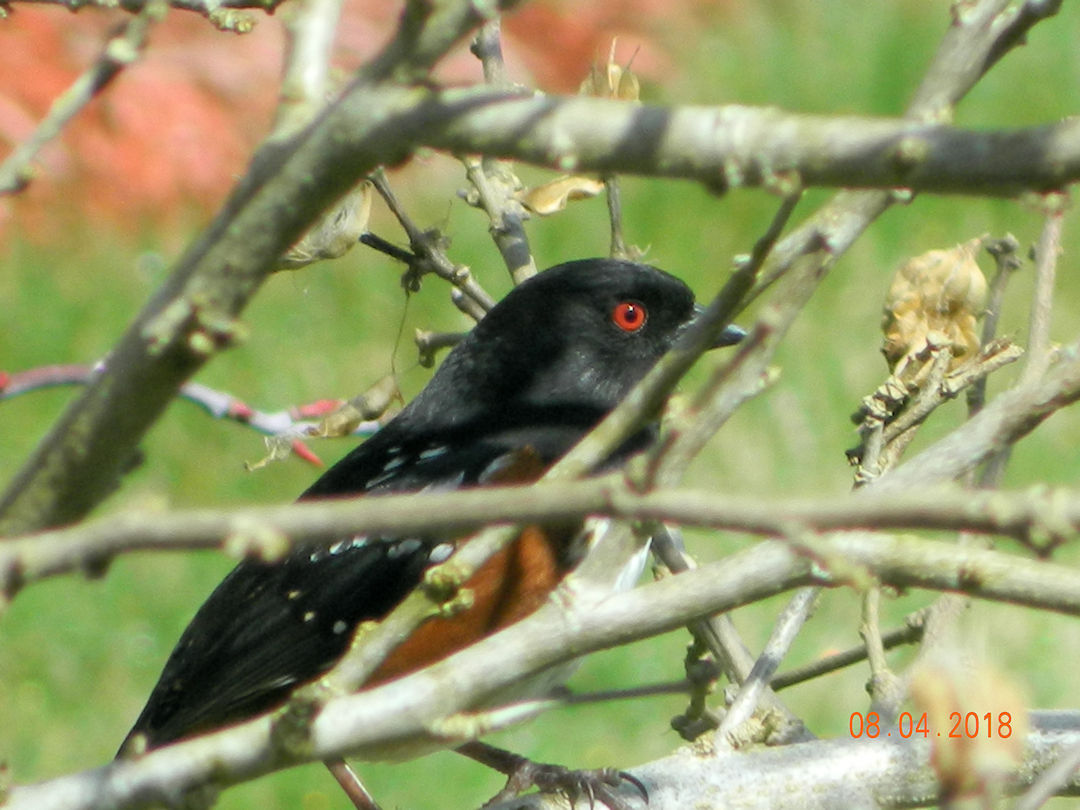 A pair of towhees lives in the neighbour's hedge. We mostly see them at ground level as they don't often go up into the trees or to the feeders where we could easily watch them.