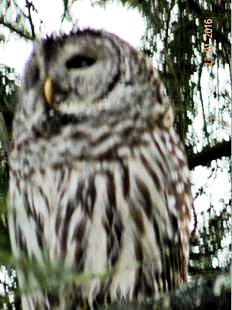 Another new visitor to the back yard. Looking for a feast of Siskins. Looks like a Barred Owl (but they are not supposed to live on our side of the Rockies). Watched while we took pictures and then moved on to better pickin's. (22:01:2016)