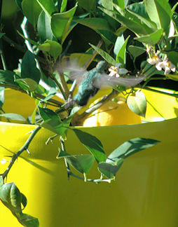 This is our resident Anna's humming bird (the guy two pictures down from here). What is new is that he is feeding on blossoms of Sheila's potted lemon tree. The tree still has 2 lemons attached from last years crop! Just below the branch below him to the right you can see one of the lemons.