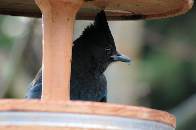 We have a pair of Stellar's Jays who drop by once or twice a week, but seldom sit still long enough for a photo. They have a hard time getting into the seed tray. This one stayed put when Allan went outside!