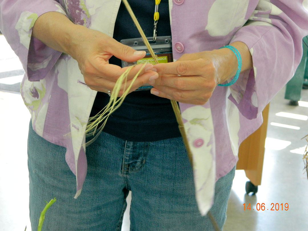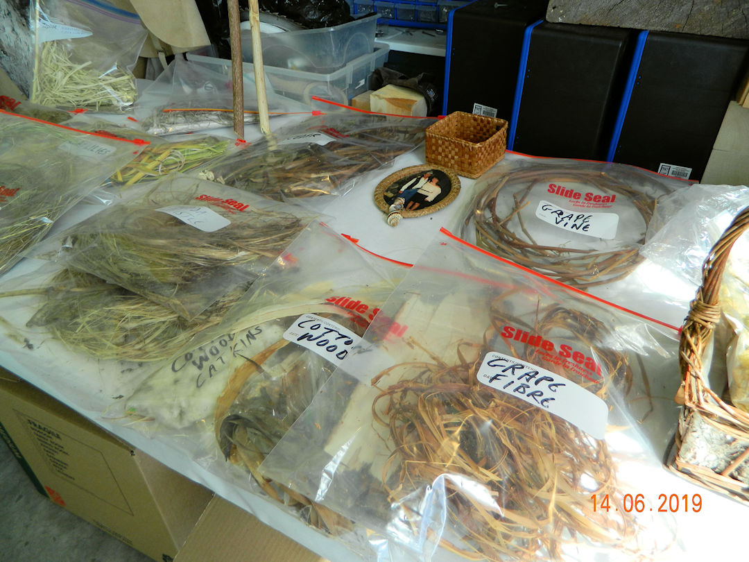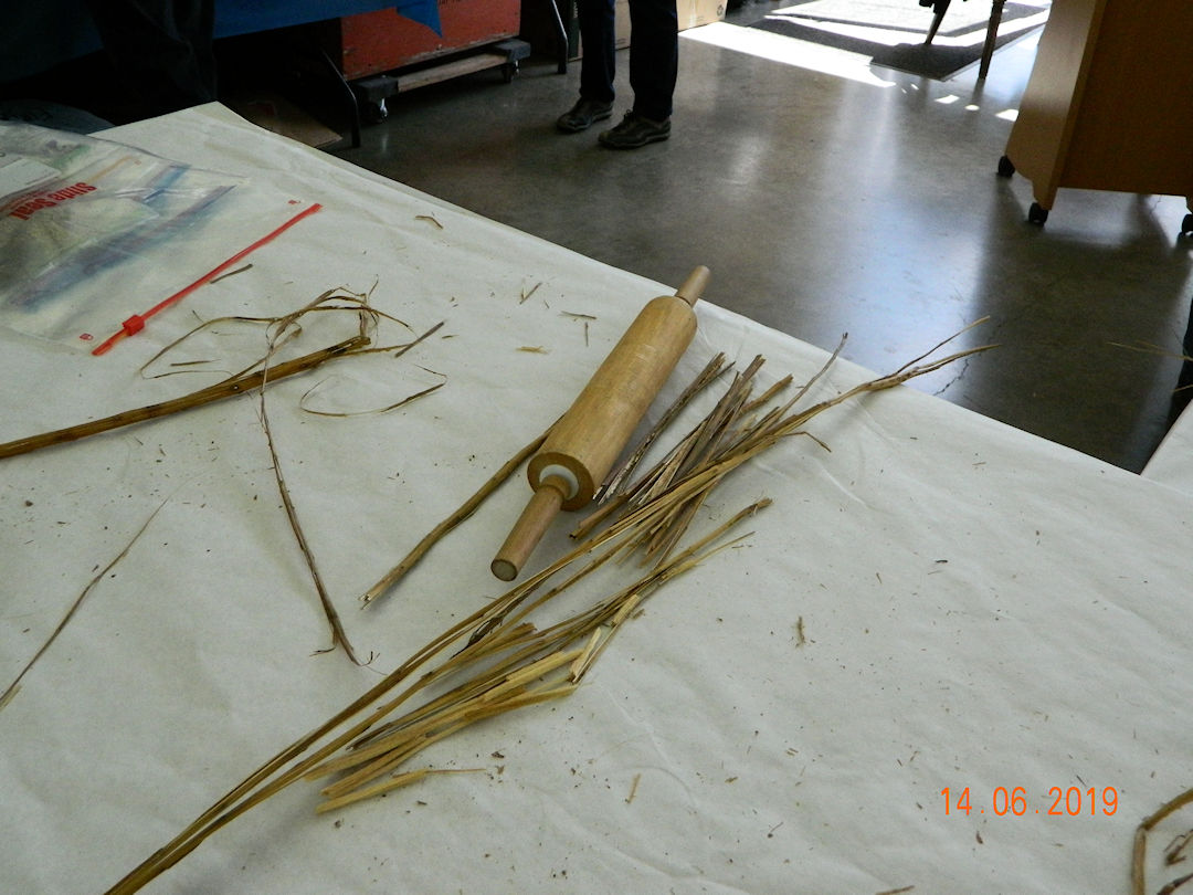 On this page are two seminars by Sue Perron. In the first, "Fibres on the Wild side", we learned about using both wild and domesticated plants for fibre for weaving and basket making. Here I was using a rolling pin to break the outer fibres of dried fireweed and get at the long fine fibres inside.