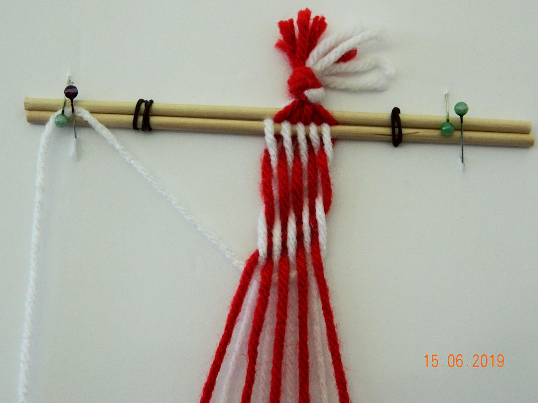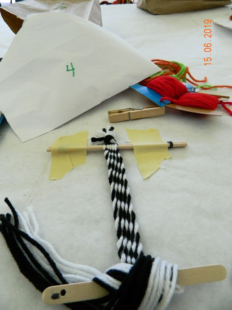 Then we learned a bit about how they are made. Here is my beginning attempt at making a small finger woven band.