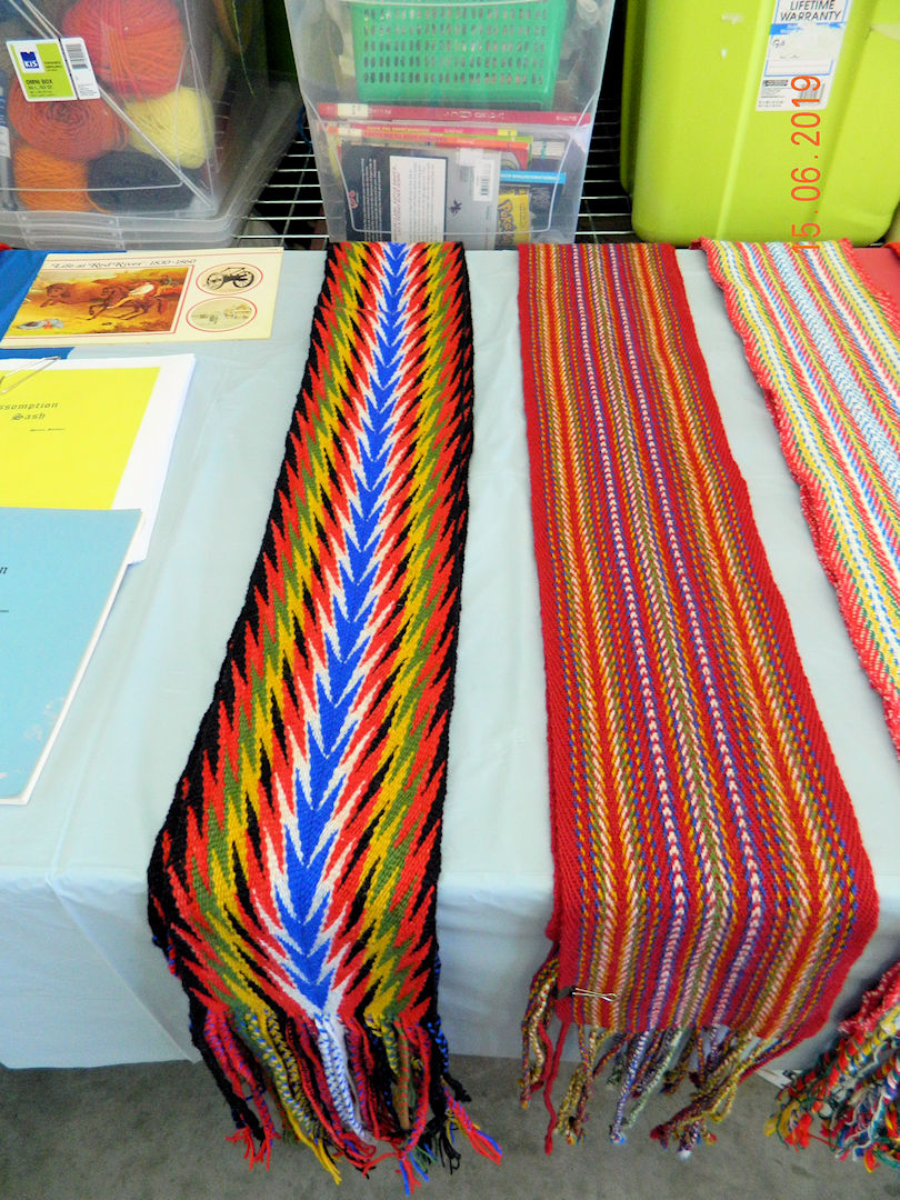 These are finger woven Assomption sashes. Notice the sharper arrows in the sash on the left.