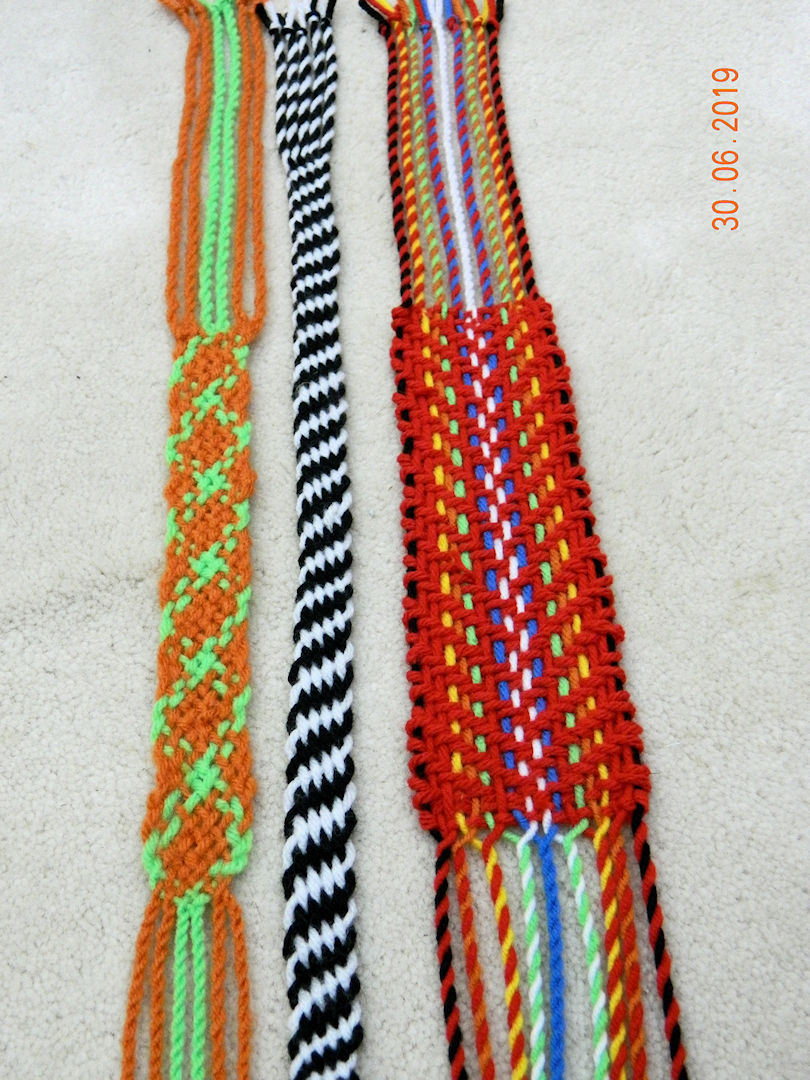 Two finger woven "sashes" on the left and the competed need woven sash on the right.