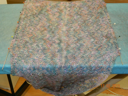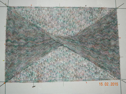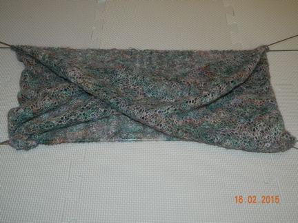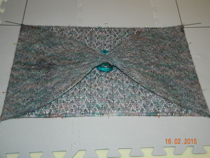 |  | Knitted lace is usually all wrinkled up when you finish knitting and needs to be blocked (spread and flattened) to show off the lace pattern.  That's hard to do when you have a loop with a twist! It has been washed, wires were run through every stitch along the edges, then two more wires pinned into the folds. (15:02:2015) | |||