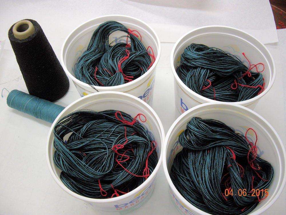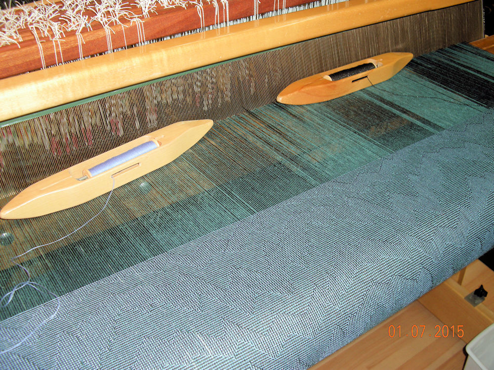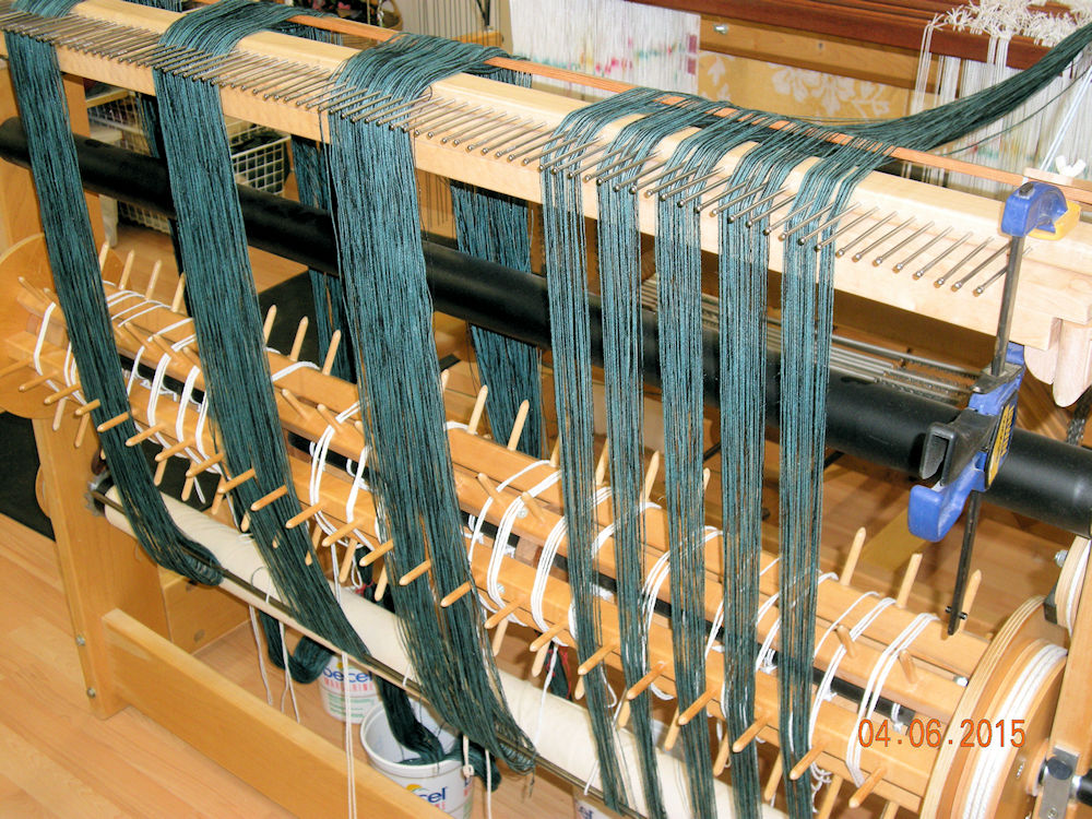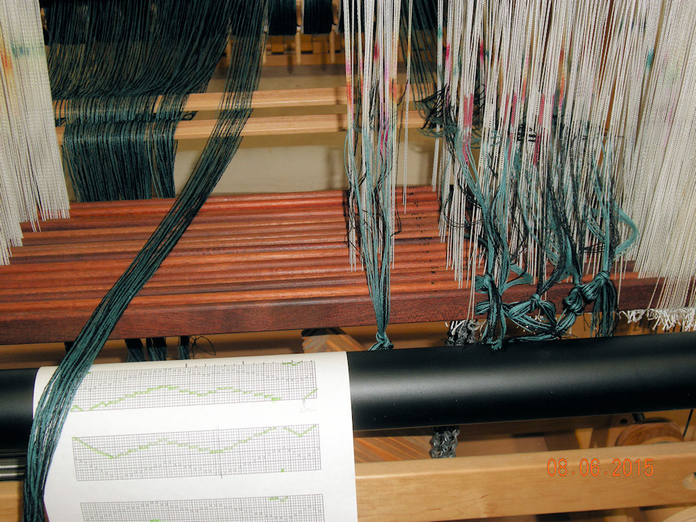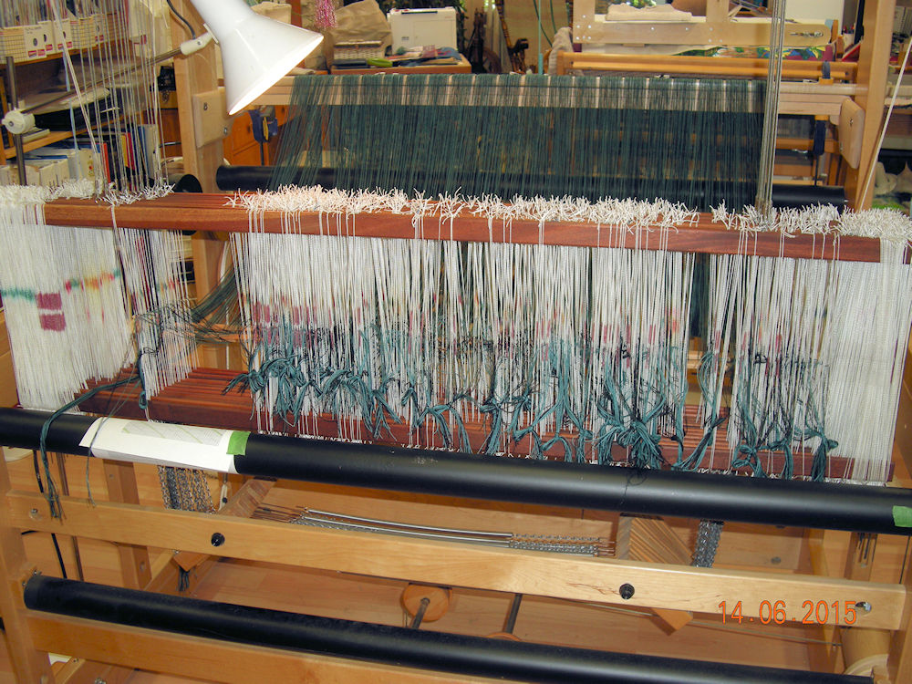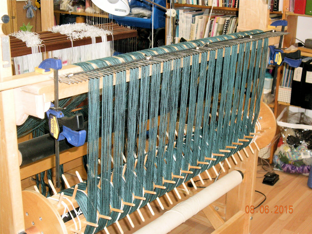 |  | Threading in progress.  There were 206 threads in each repeat of the pattern so threading took several days.  The green and black threads alternate in a parallel pattern spread over 16 shafts. (08:06:2015) | |||