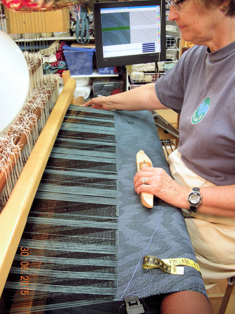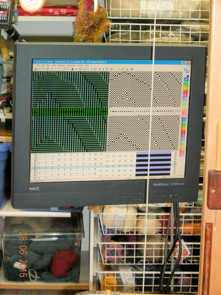 |  | On my AVL loom the shafts to lift for weaving are controlled by the pattern in the computer.  Each time a treadle is pressed the computer moves to the next row in the pattern and tells the dobby head with shafts to lift. (28:06:2015) | |||
