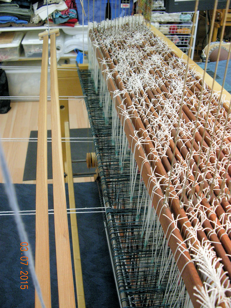 |  | The reed is in place in the beater and all 976 ends have been sleyed through the reed. (23:06:2015) | |||
