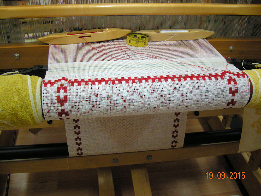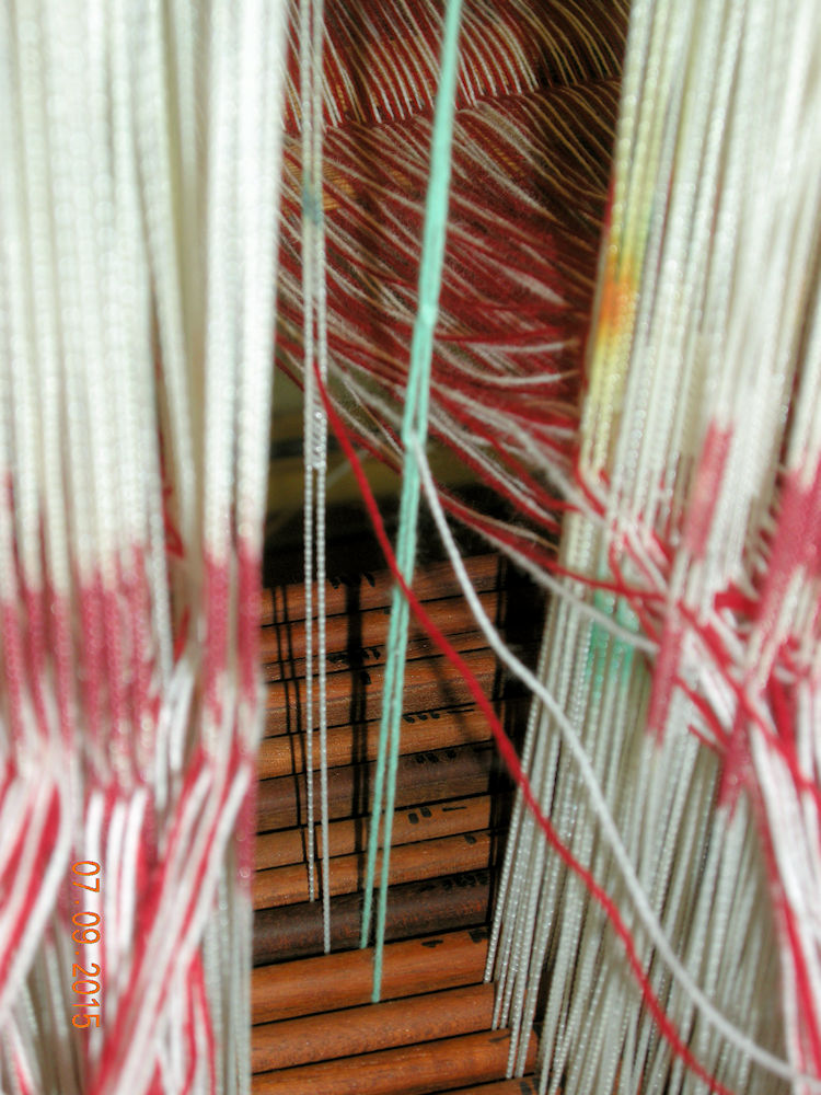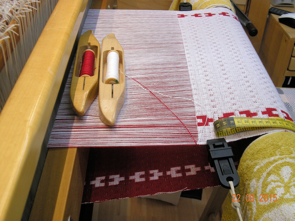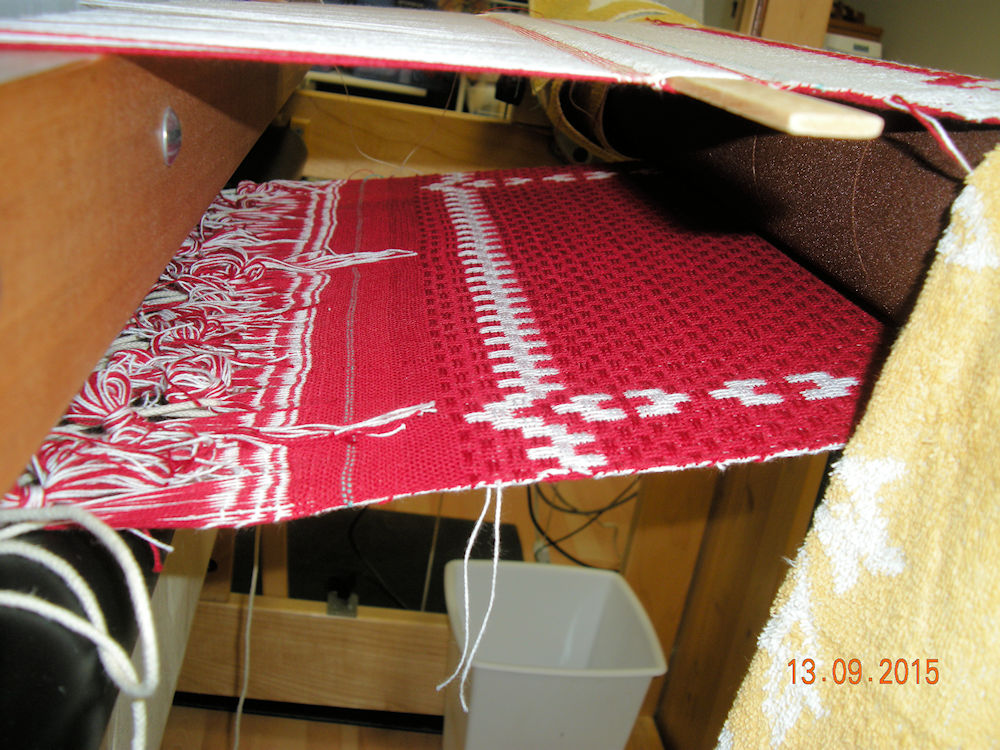 | Weaving is under way. The side that is up will be mostly white, the other side will be mostly red but the colours sometimes trade sides. (12:09:2015) |  | |||