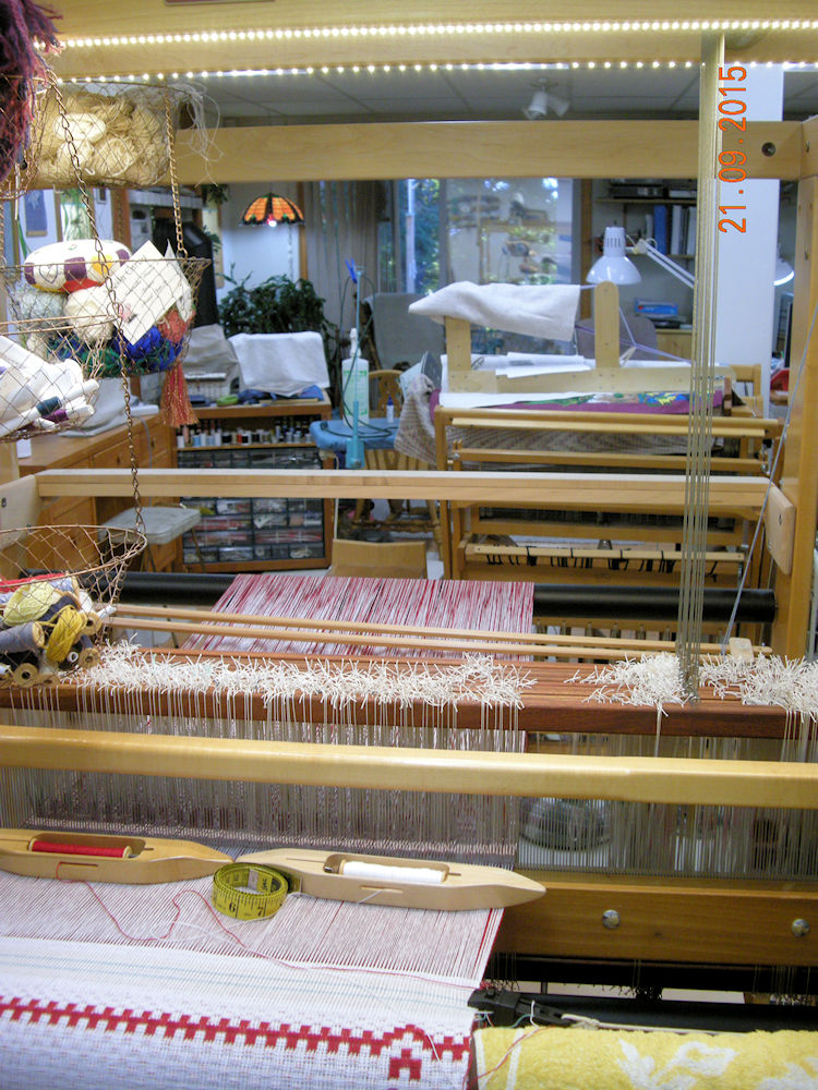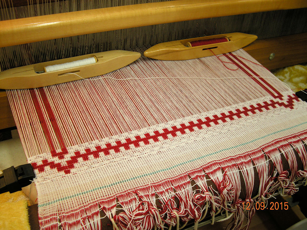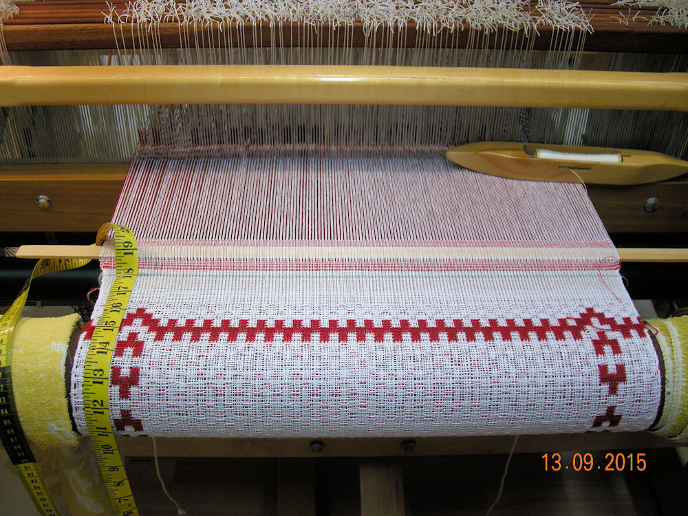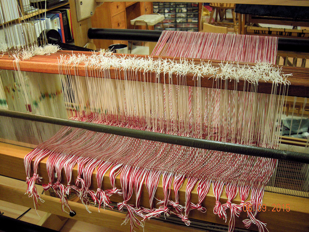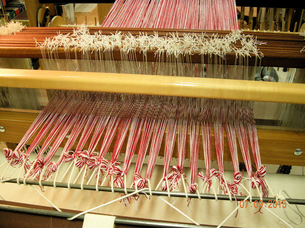 | Weaving is under way. The side that is up will be mostly white, the other side will be mostly red but the colours sometimes trade sides. (12:09:2015) |  | |||