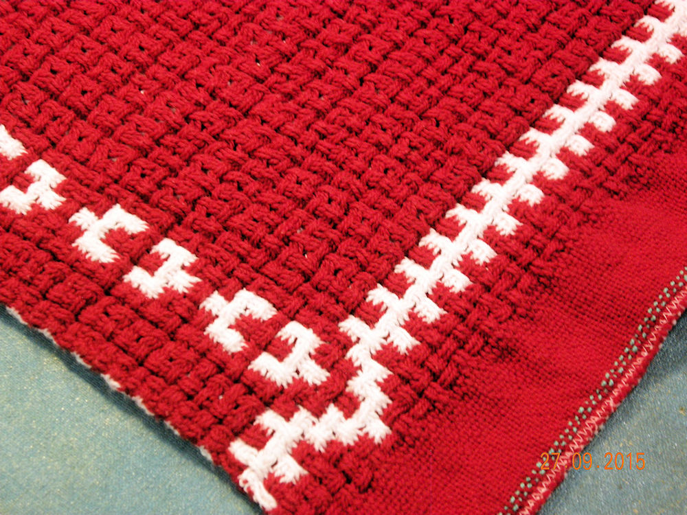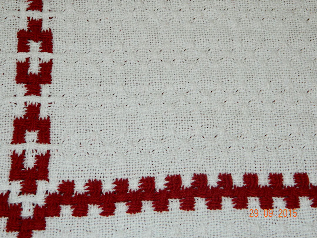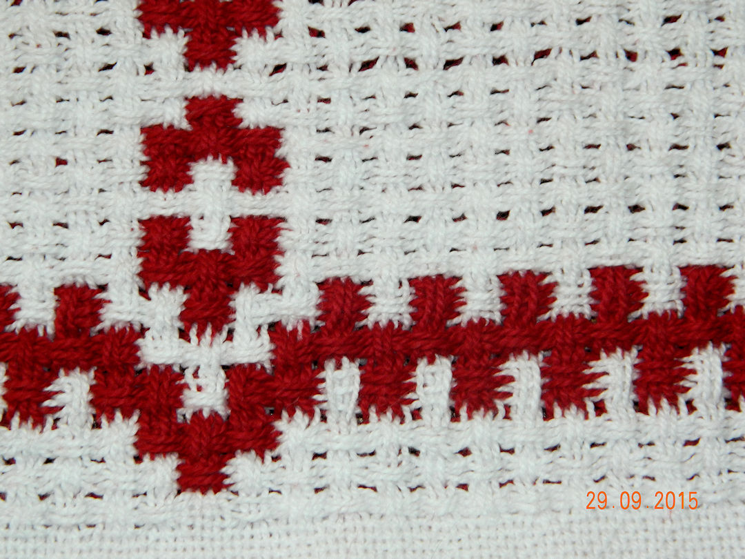 |  | The white side of #2 has a  slightly different spot pattern than the red side. This one had more "plain weave" on both sides and made firmer fabric than the allover lace. (29:09:2015) | |||