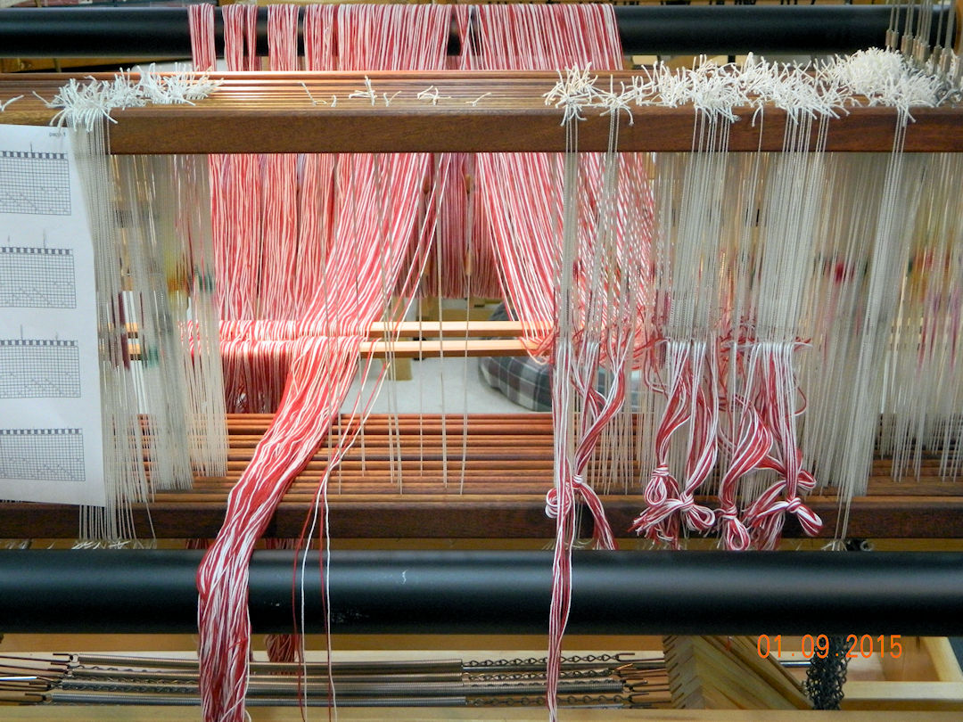 |  | Ten yards of red and white cotton have been wound on the warping mill, then beamed on the AVL and are ready for threading to start.  In spite of how they look in the photo, each thread is either red or white, not a mixture! (01:09:2015) | |||