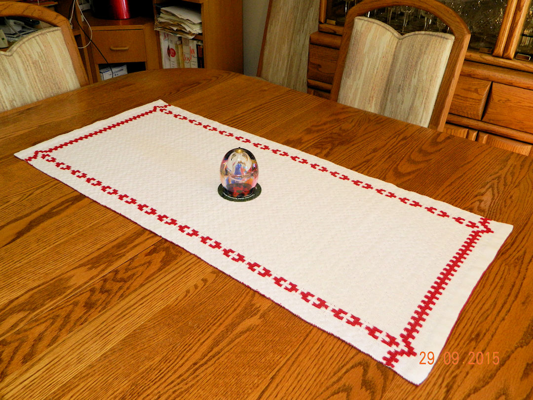 |  | And the "Christmas" side.  This runner is leaving in a few days as part of a Guild of Canadian Weavers exchange.  I will receive a runner made by someone else. (29:09:2015) | |||