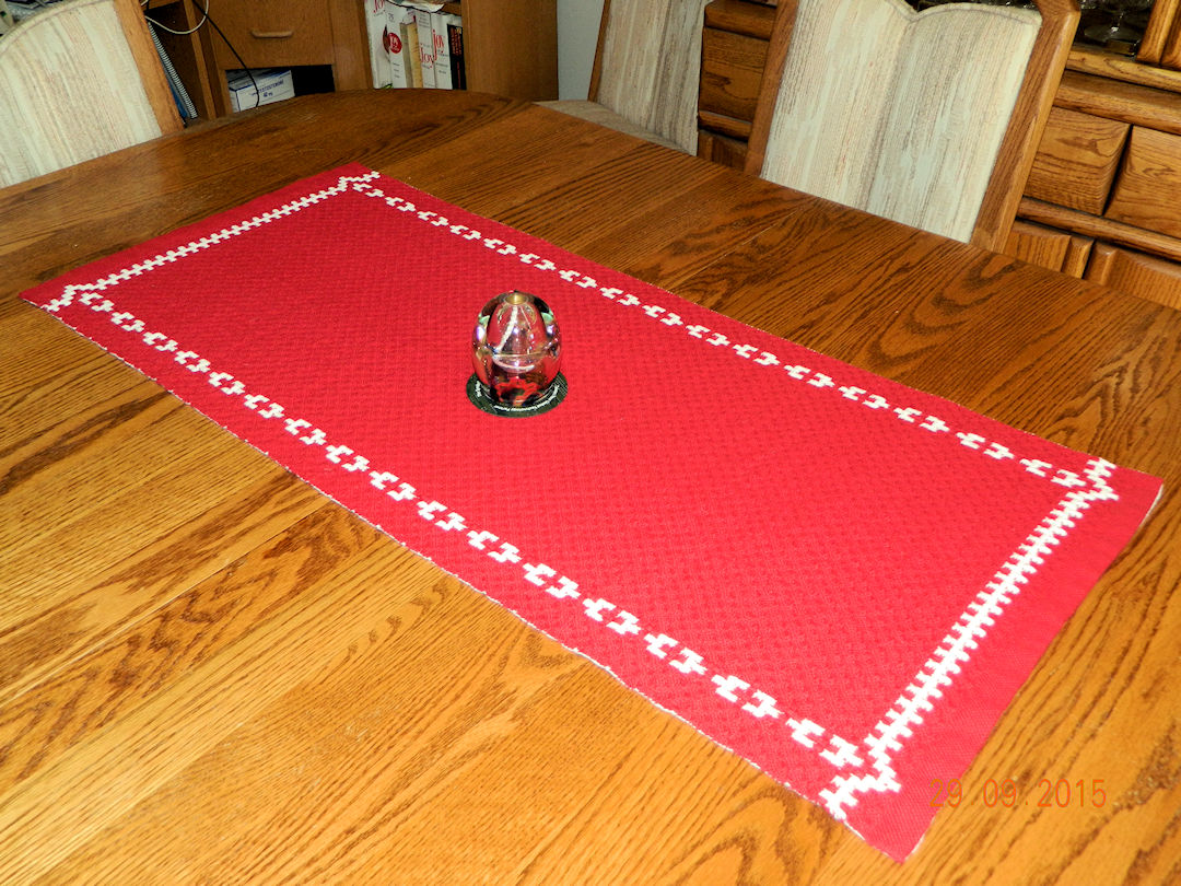 | Both sides at once. There are still about six yards of warp left on the loom so I am planning more runners and maybe some place mats. There will probably be more design changes too. (29:09:2015) |  | |||