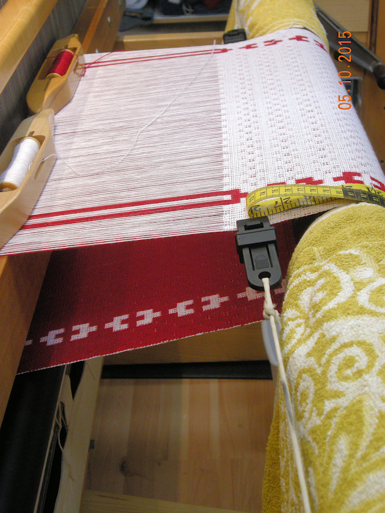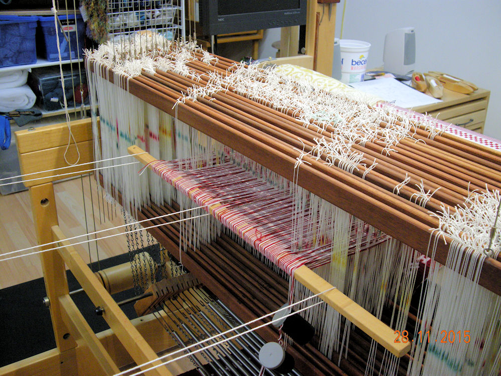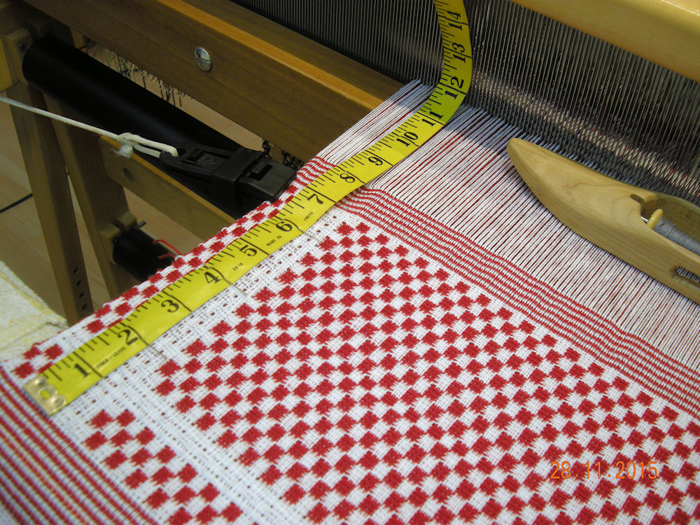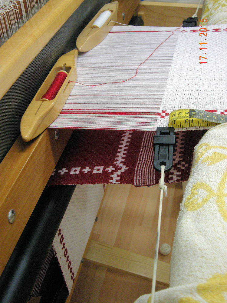 | At the end I squeezed in a short trial of checkerboard pattern - every "half block" of lace moves to the alternate side of the cloth. Weaving stopped just four inches from the reed. (28:11:2015) |  | |||