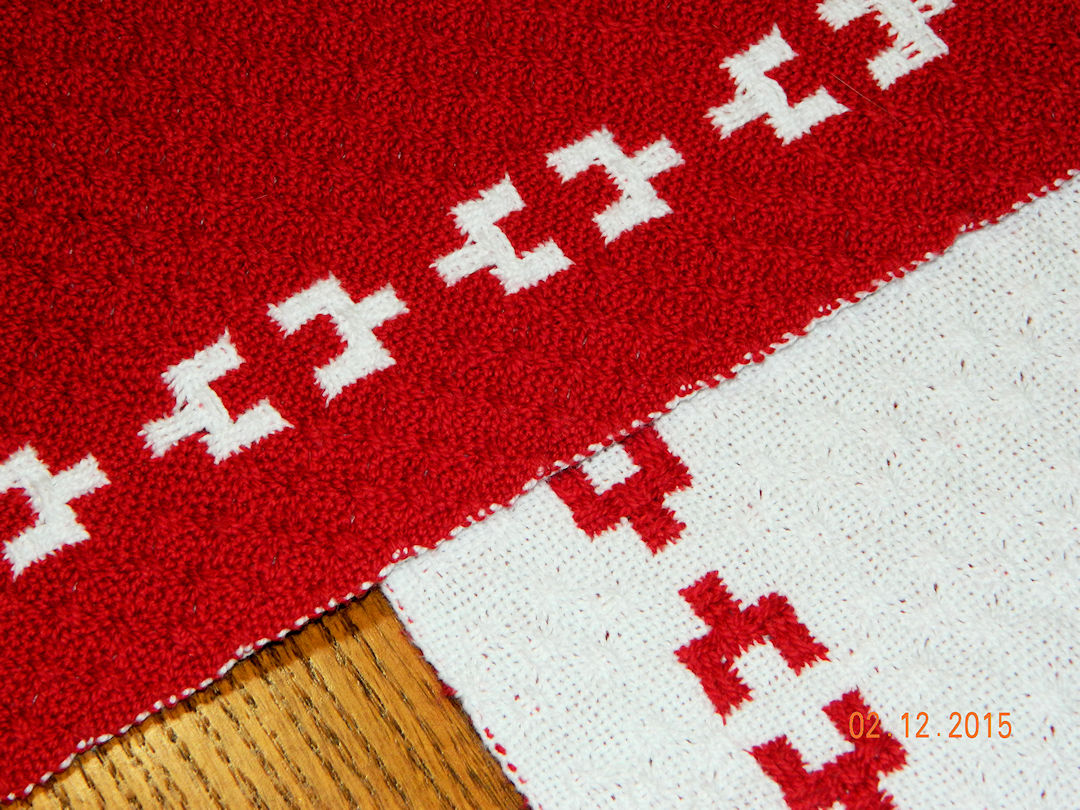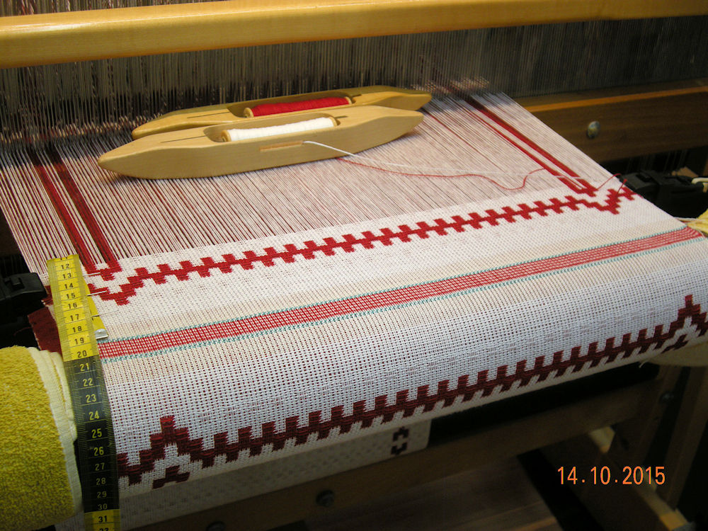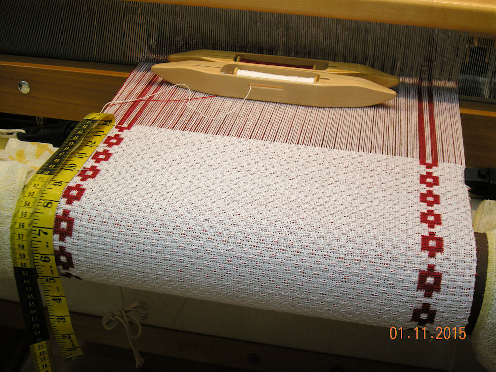 |  | After about two weeks there has been a big change.  The runners were cut off, then the warp was re-sleyed from 16 ends per inch to 20 ends per inch.  This reduced the width from 20 to 16 inches so the finished width should be about right for the width of a place mat.  After tying on again, weaving is underway.  The first place mat has a different border pattern than the runners and the background is all-over huck lace. (01:11:2015) | |||