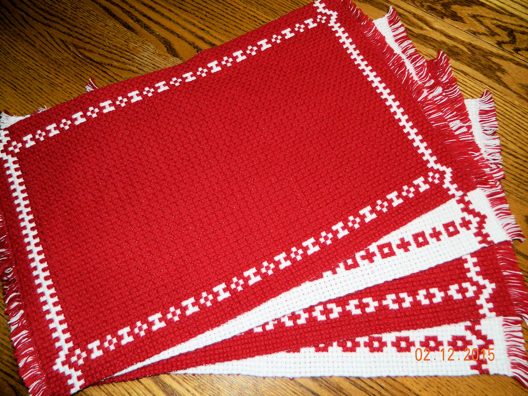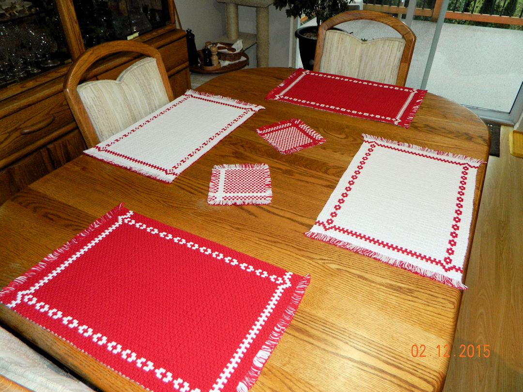 |  | And another look at the placemats.  Note that each one has been given a different border pattern by varying the treadling while weaving.  They are thicker, and feel sturdier, than the runners. (02:12:2015) | |||