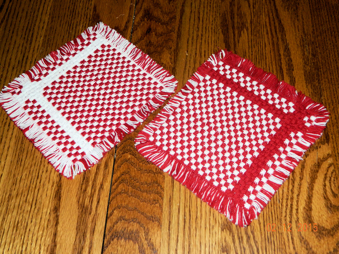 |  | Everything is off the loom and has been "wet finished" and "hard pressed."  The four place mats fit our table well and the checkered piece has been cut in half to make two hot pads. (02:12:2015) | |||