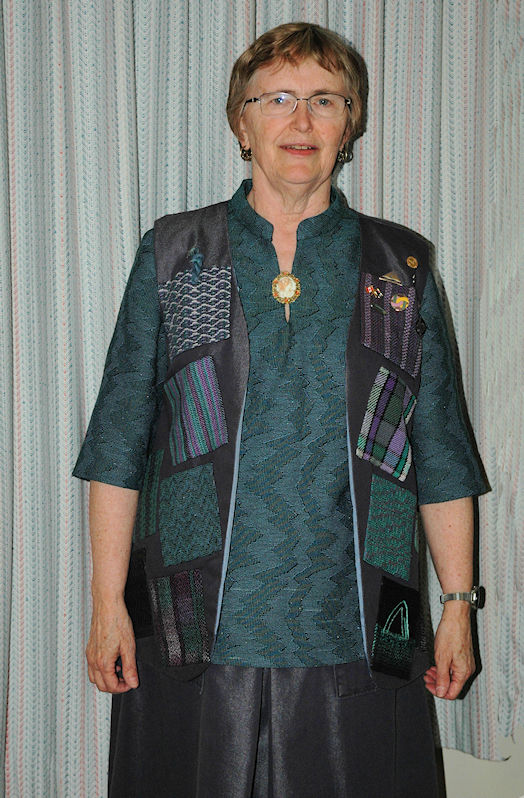 The inspiration for this blouse was a sample exchange that I took part in for Convergence 2002, a weaving conference in Vancouver. I liked the fabric that I cut up into small pieces to exchange and planned to weave more to make a blouse.