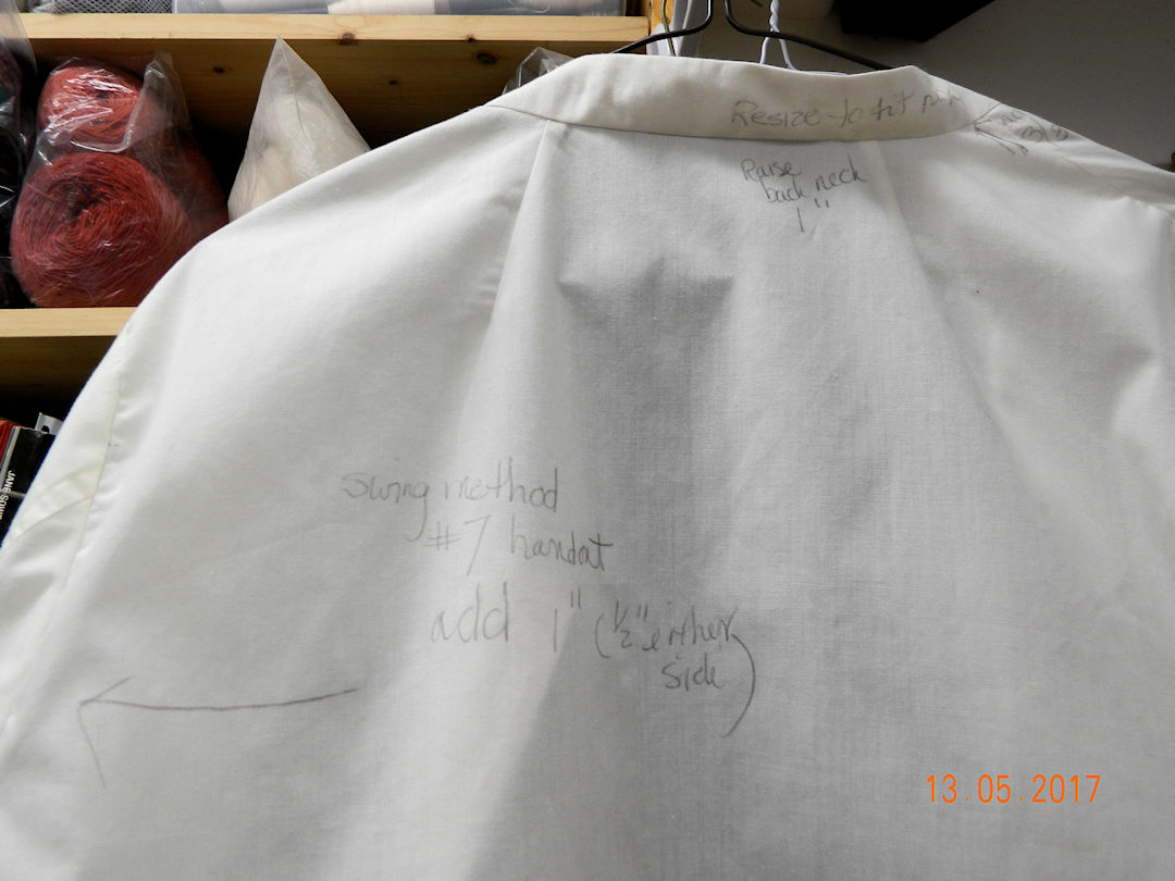 The trial blouse did NOT fit well. But in April of 2015 I was privileged to attend a workshop on sewing with handwoven fabric, taught by Daryl Lancaster. She showed me how to alter the pattern so the blouse would fit - by writing right on the muslin! After all - I was never going to wear it.