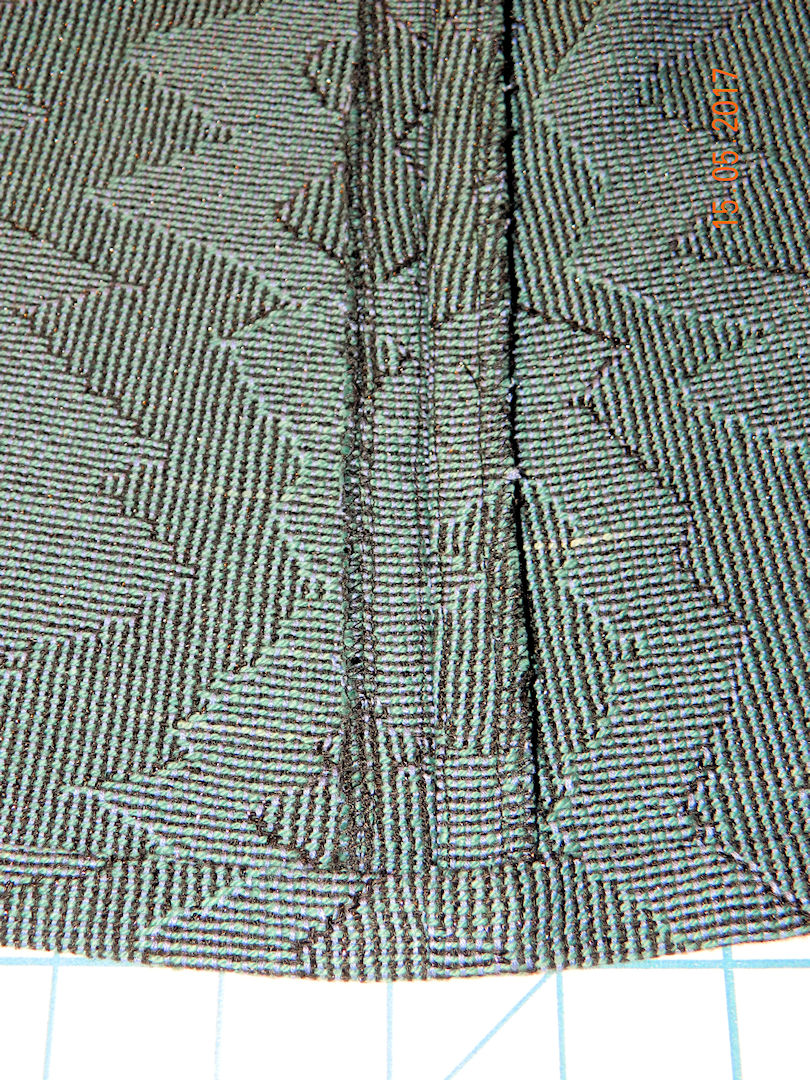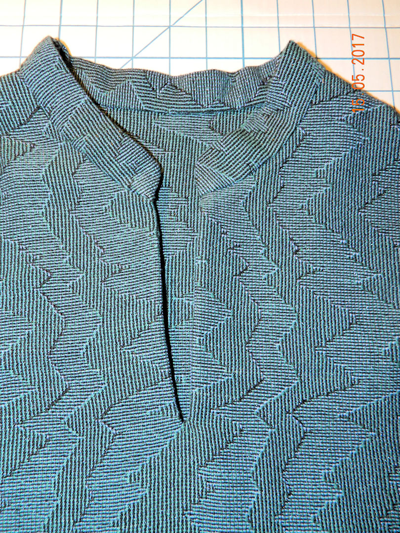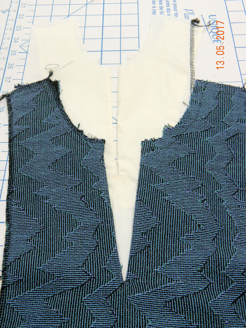 Here is a closer look at the finished neckline of the blouse. The fabric here is stabilized with lightweight fusible interfacing.