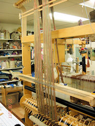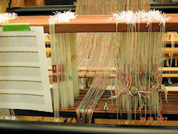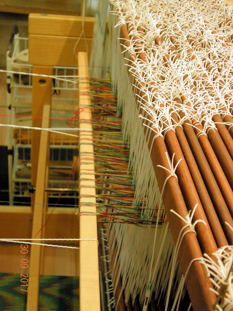 The warp - 810 ends - is about half threaded through the heddles.
