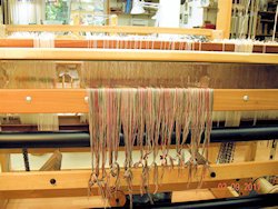 All threaded and sleyed in the reed. As this is an experiment, the left half was sleyed at a higher density than the right. After weaving some "samples" it will be cut off and washed and the correct sett to use determined.